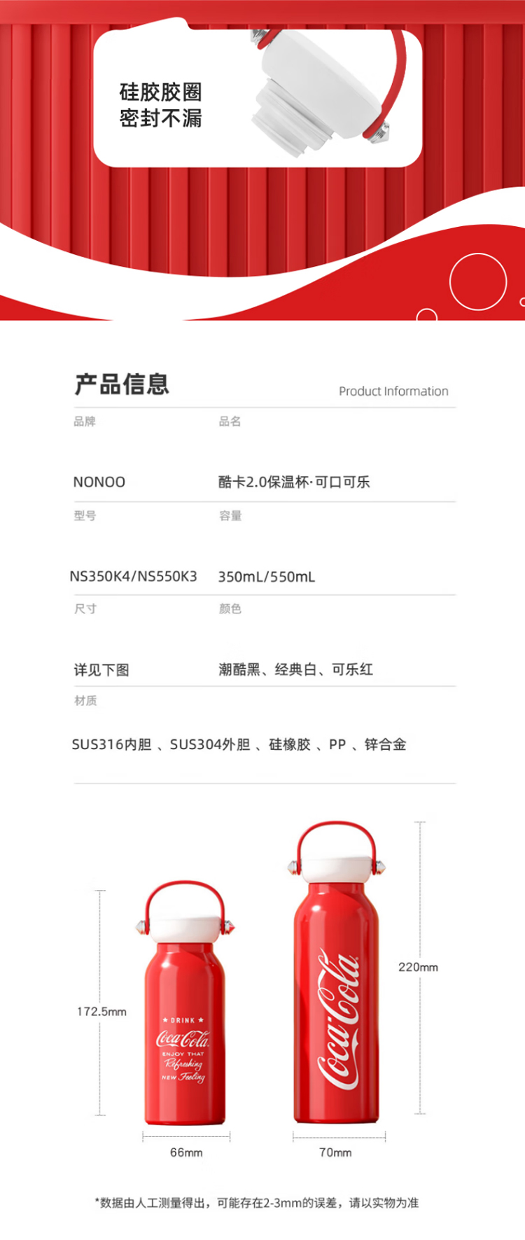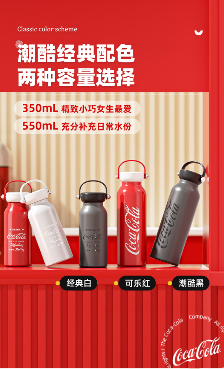 NONOO可口可乐联名水杯男女潮酷保温杯316不锈钢户外运动保冷水杯 350ml 可乐红- 350-550ml