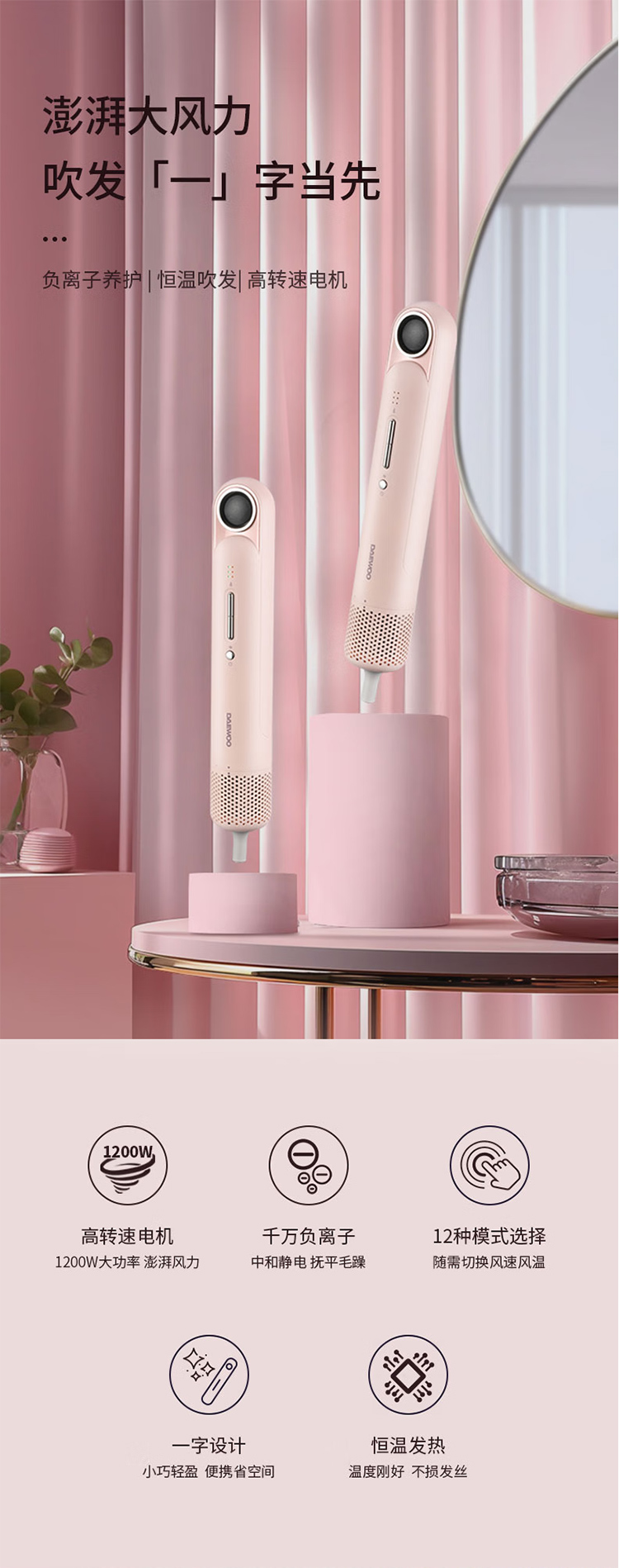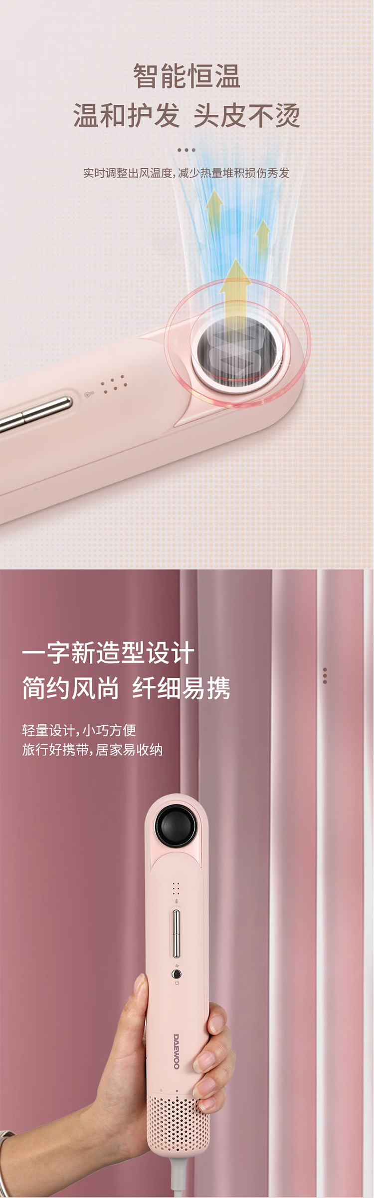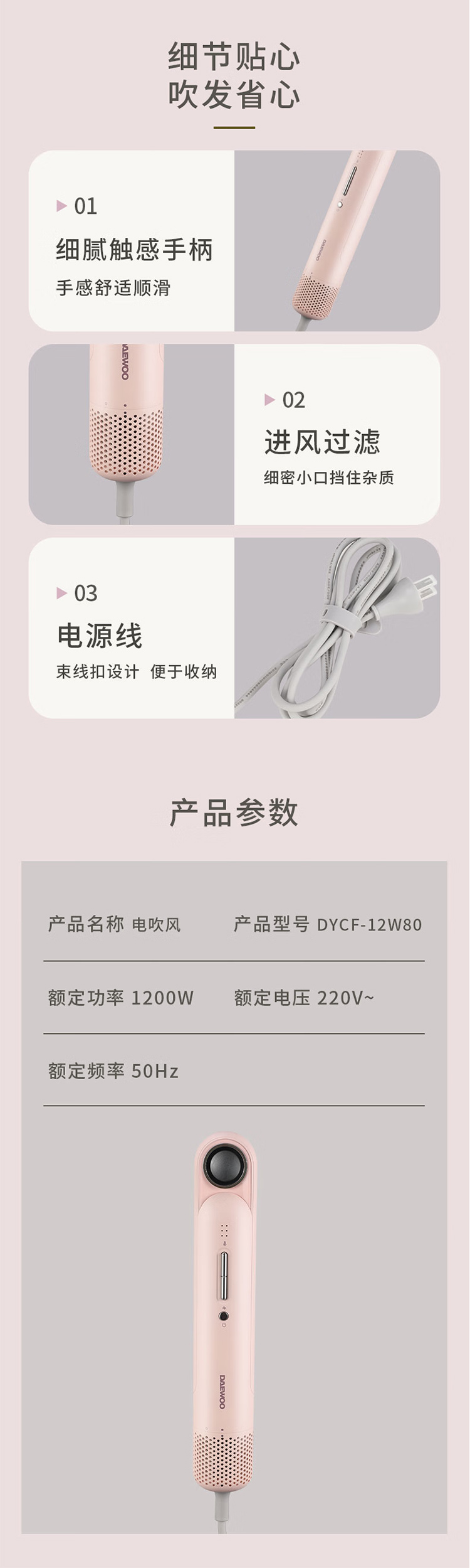 大宇(DAEWOO)电吹风家用旅行速干头发负离子护发迷你便携式吹风筒 DYCF-12W80 香缇粉
