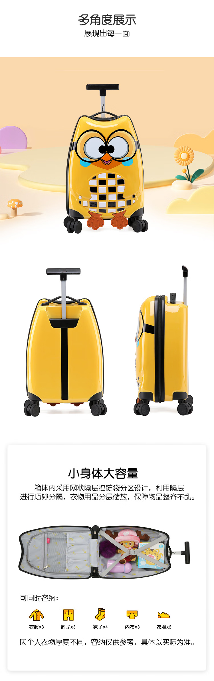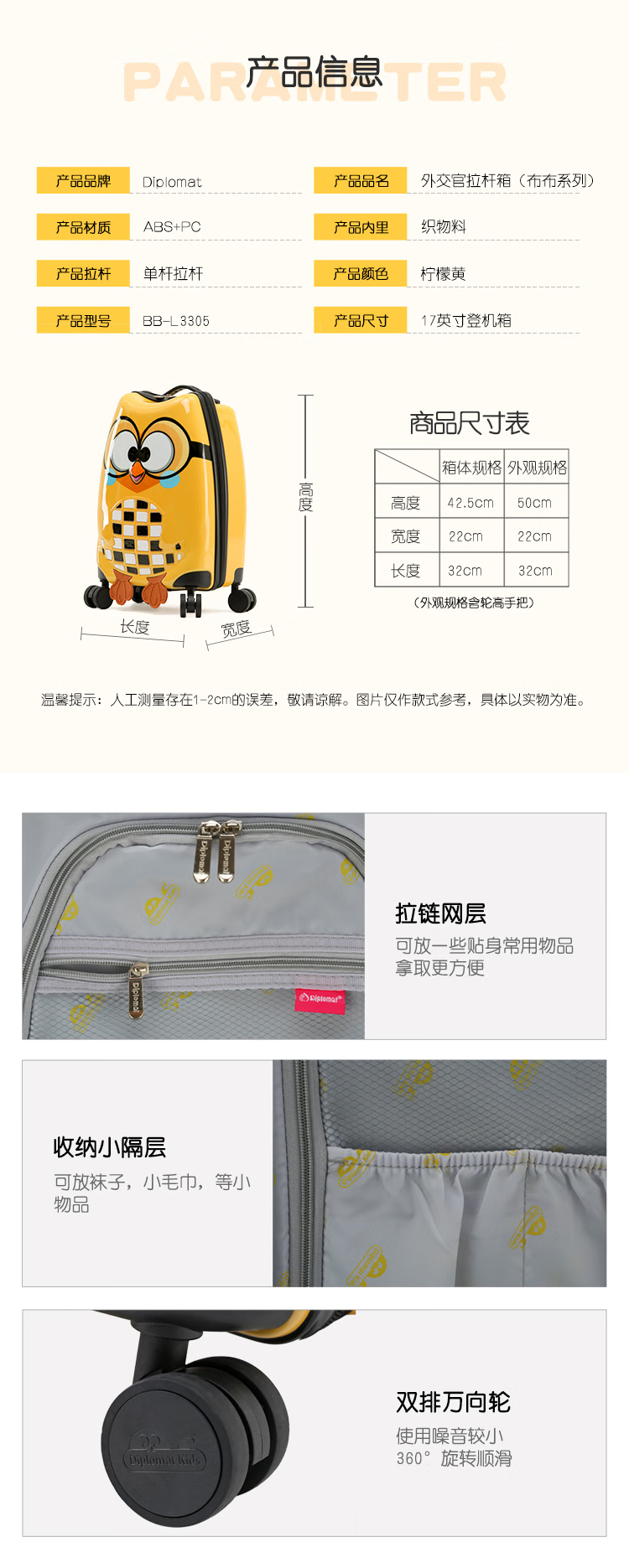 Diplomat外交官行李箱布布联名儿童可爱小学生可登机拉杆箱BB-L3305系列 黄色 17英寸 -适用短途【可登机】