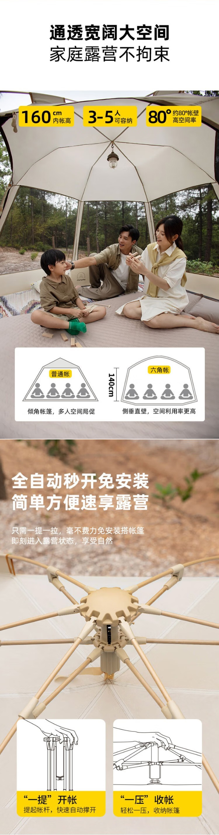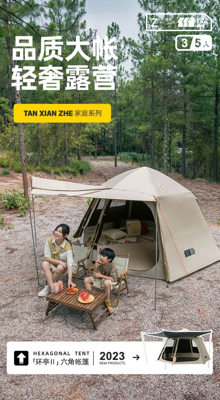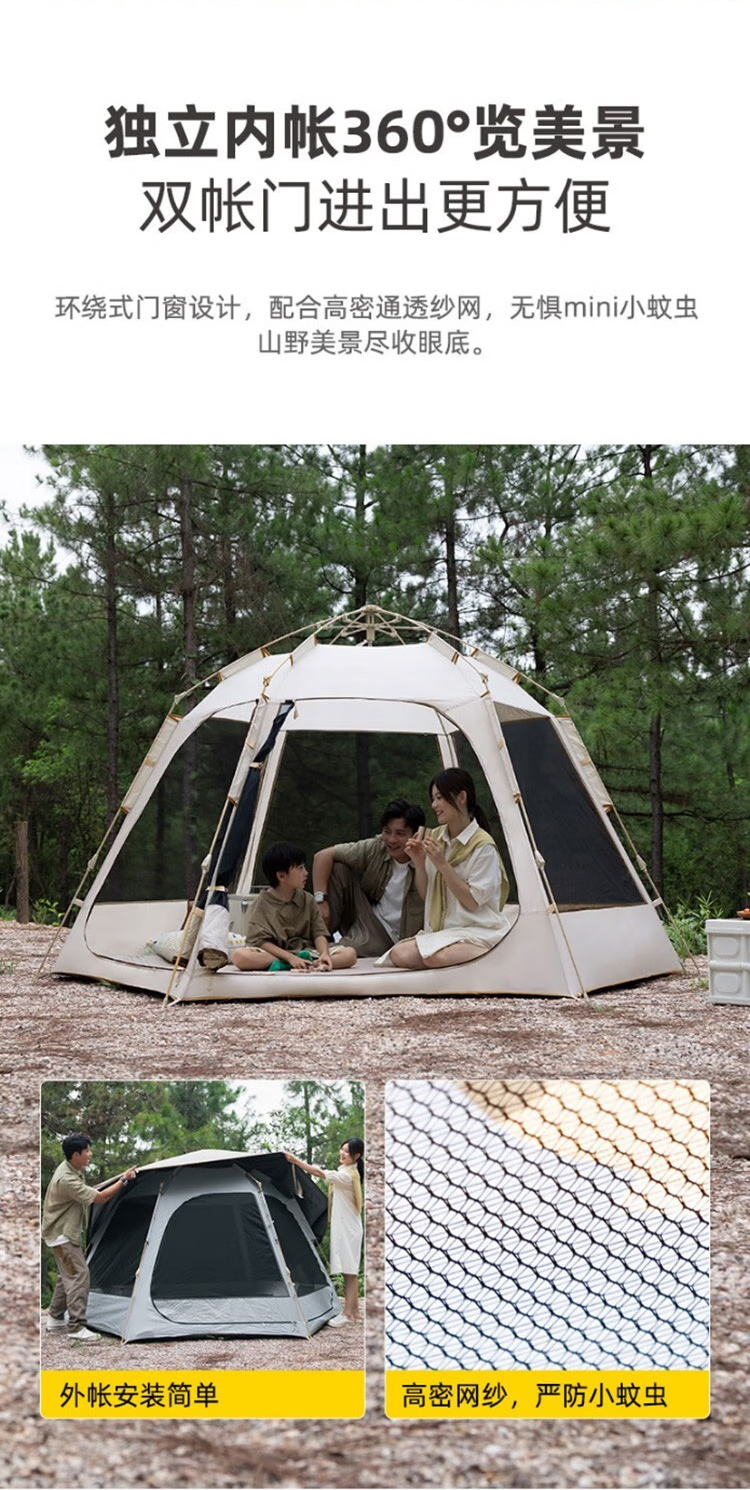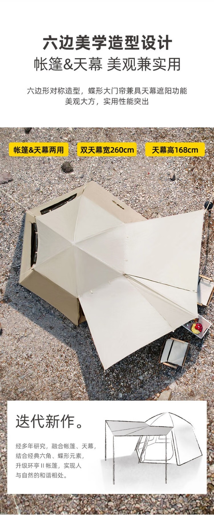 TANXIANZHE探险者户外露营帐篷天幕便携折叠大门厅天幕六角黑胶加厚防晒防雨 卡其色5-8人黑胶六角双门厅帐篷