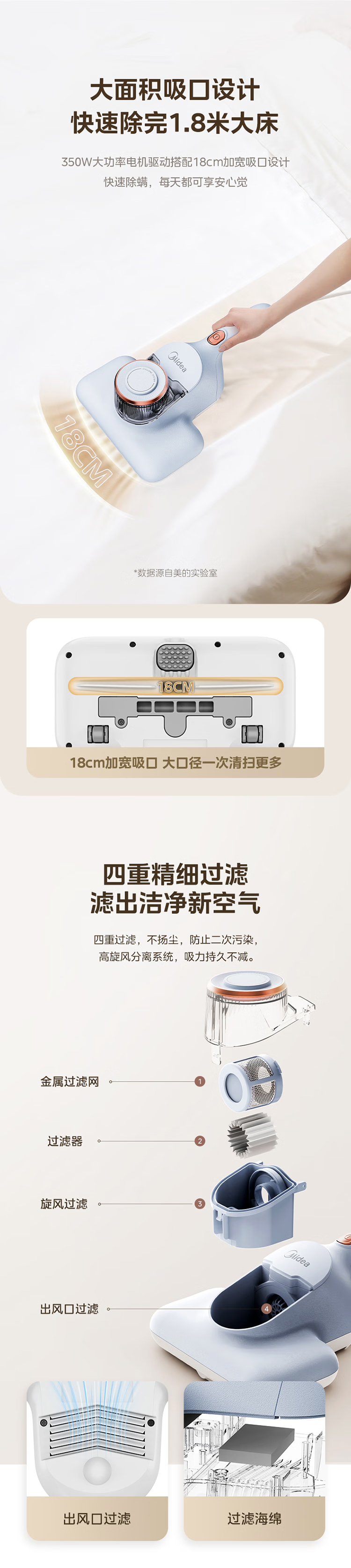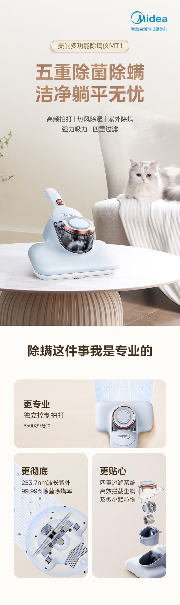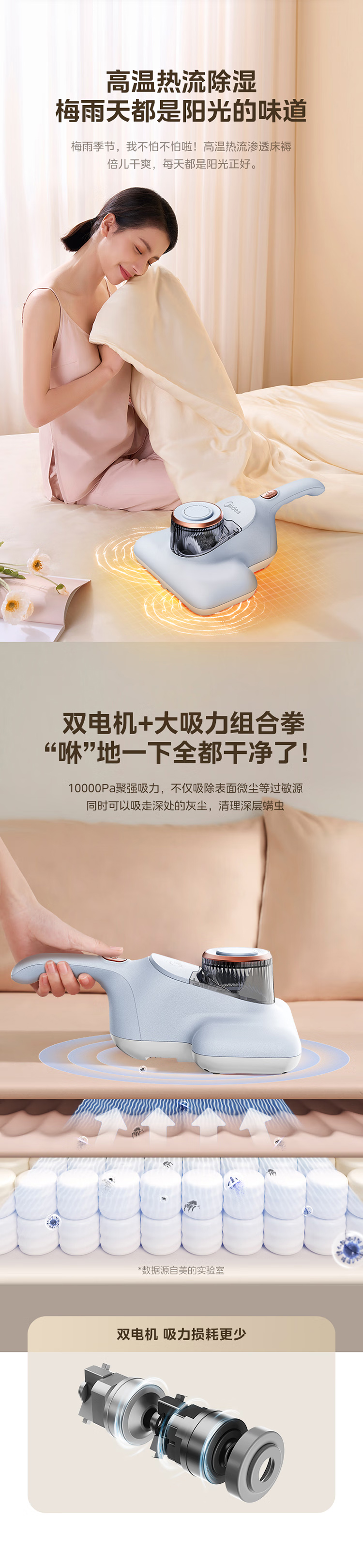 美的(Midea)除螨仪双电机强吸力高频拍打 热风干爽 UV紫外线家用床铺沙发除螨有线吸尘MT1
