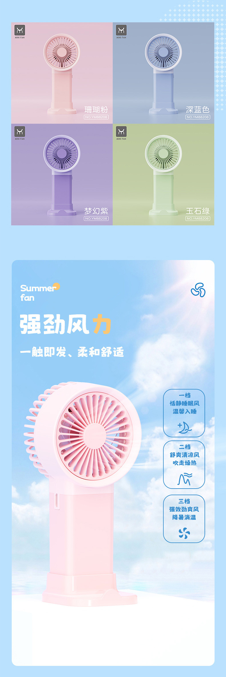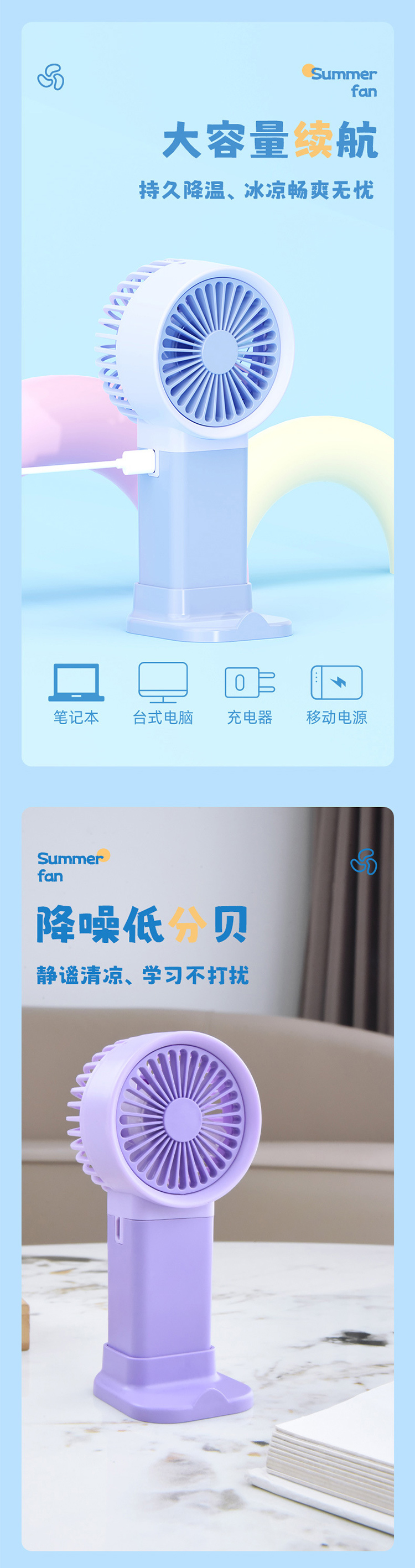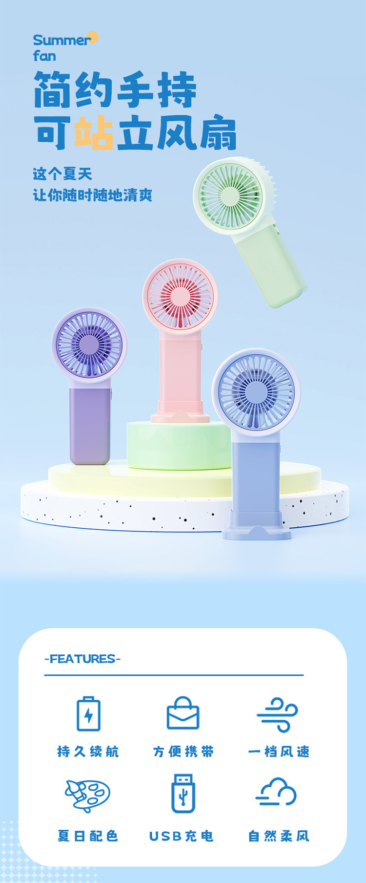 马卡龙带底座支架手持小风扇三档风充电夏季学生户外随身礼品