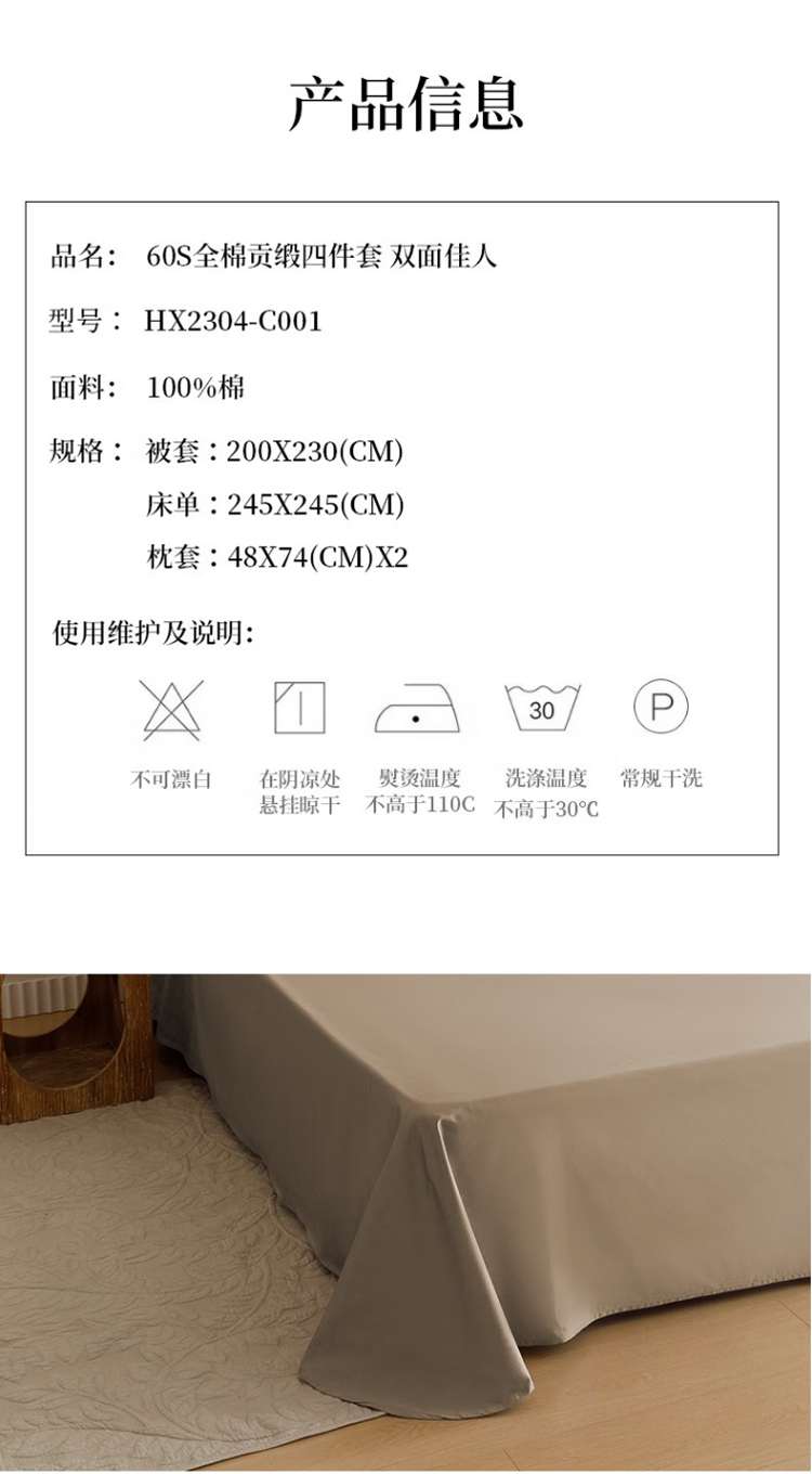 红秀世纺60s全棉贡缎四件套 双面佳人 被套:200*230cm