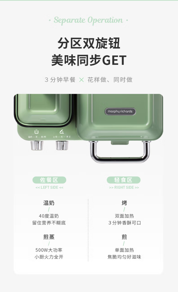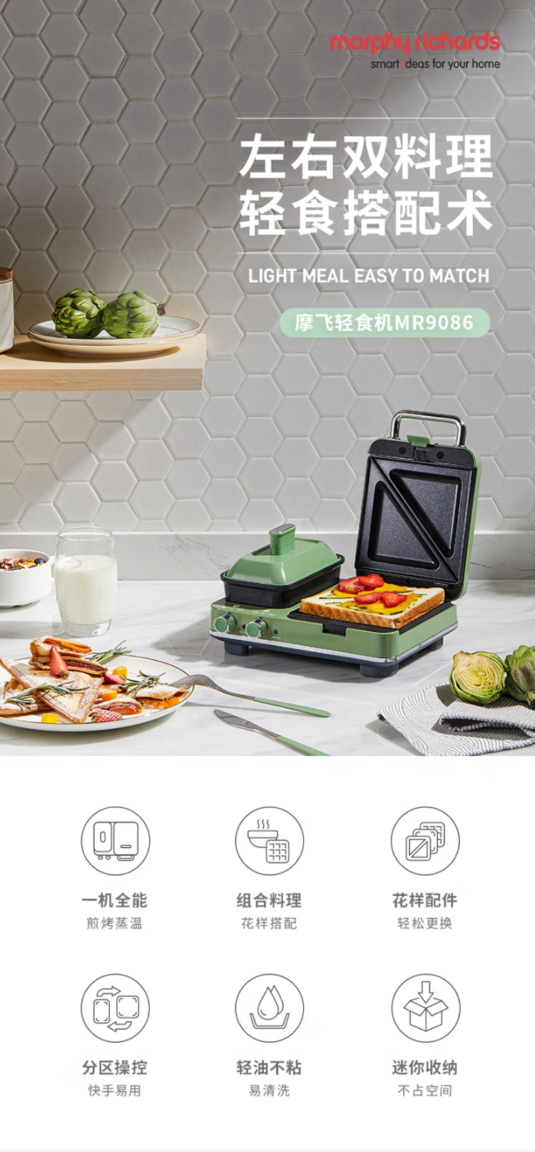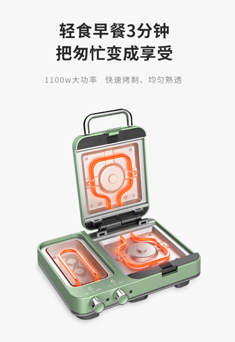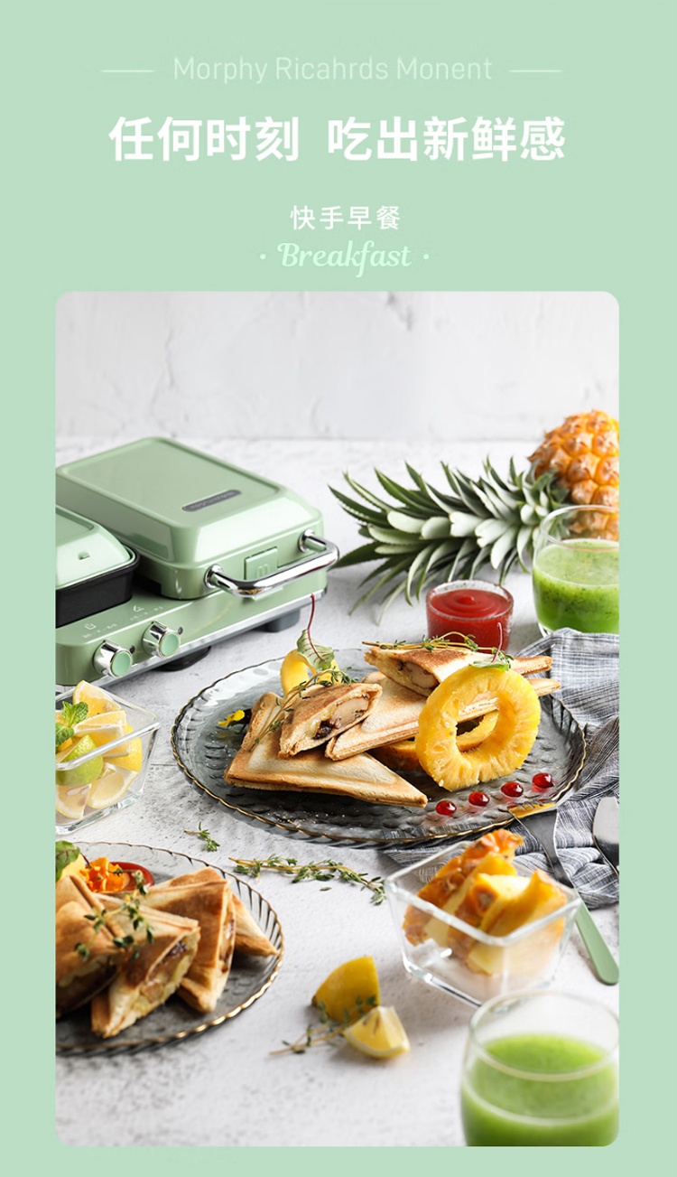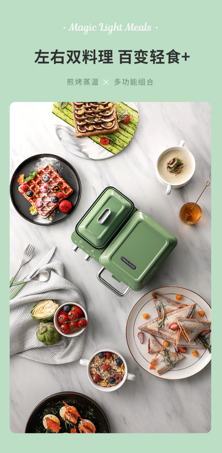 摩飞电器(Morphyrichards)早餐机电饼铛家用三明治机电饼档家庭用 多功能双区料理轻食机面包煎烤机蛋糕机 MR