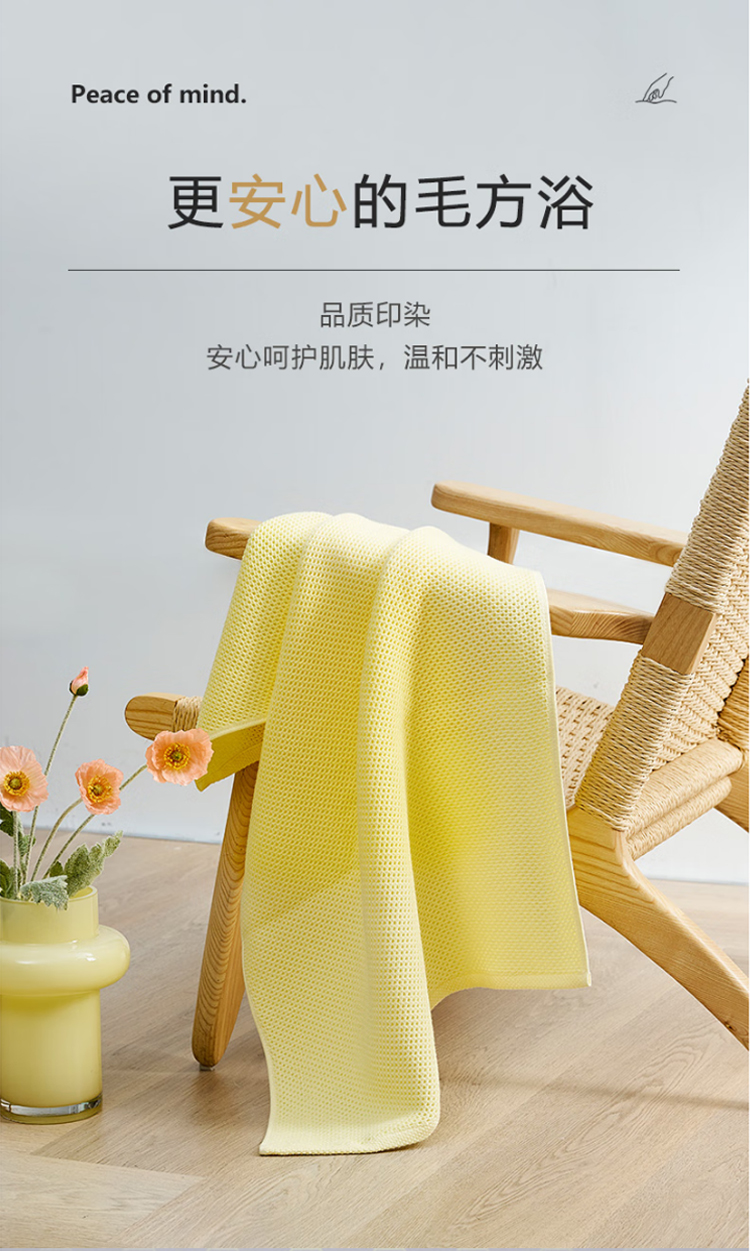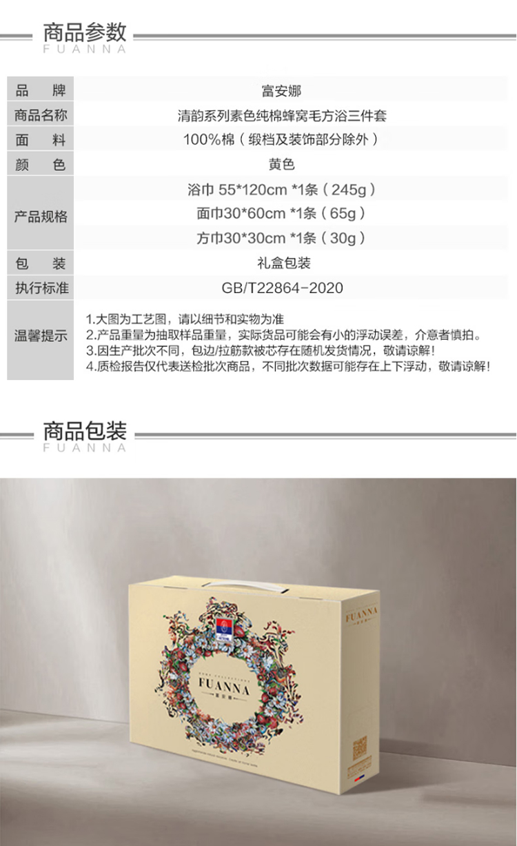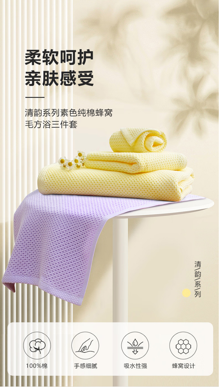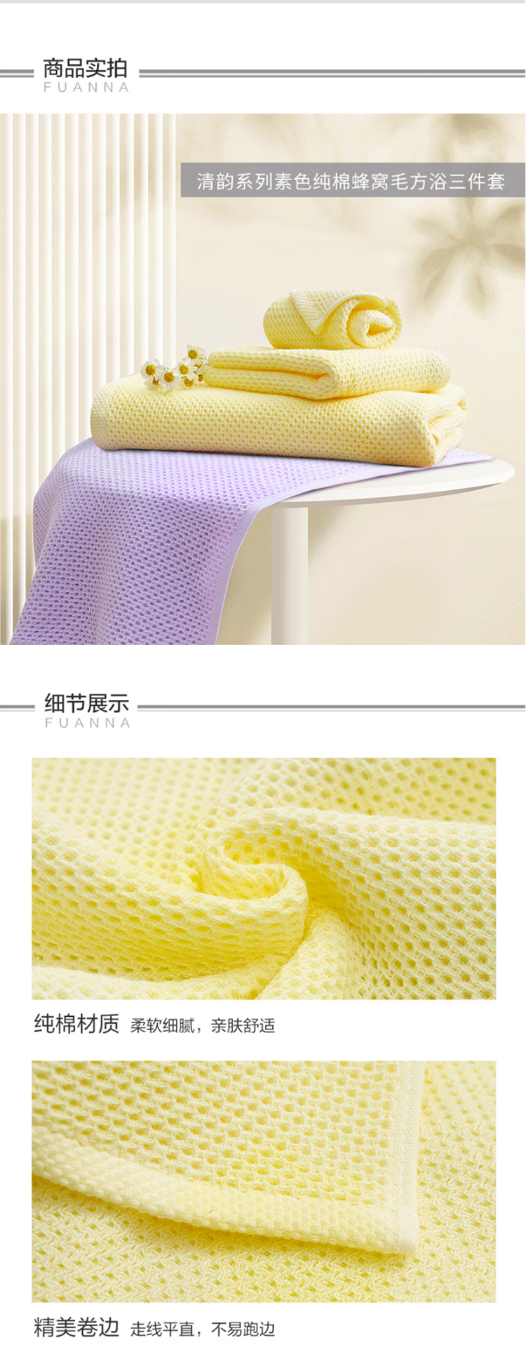 富安娜【天津】t富安娜清韵系列素色纯棉蜂窝毛方浴三件套\黄