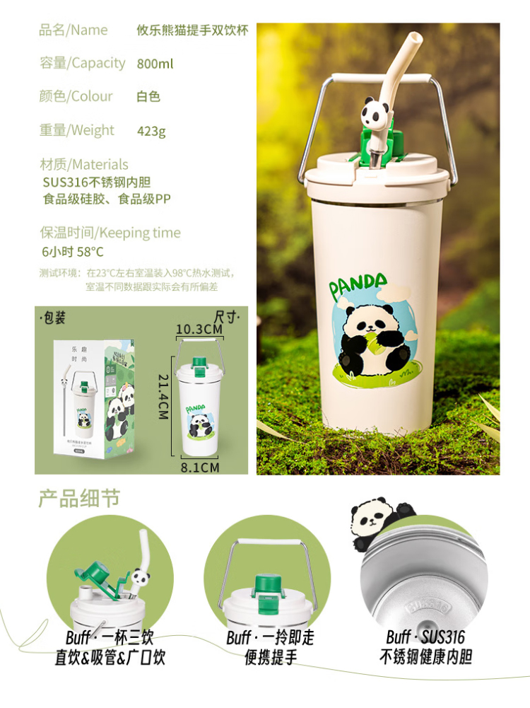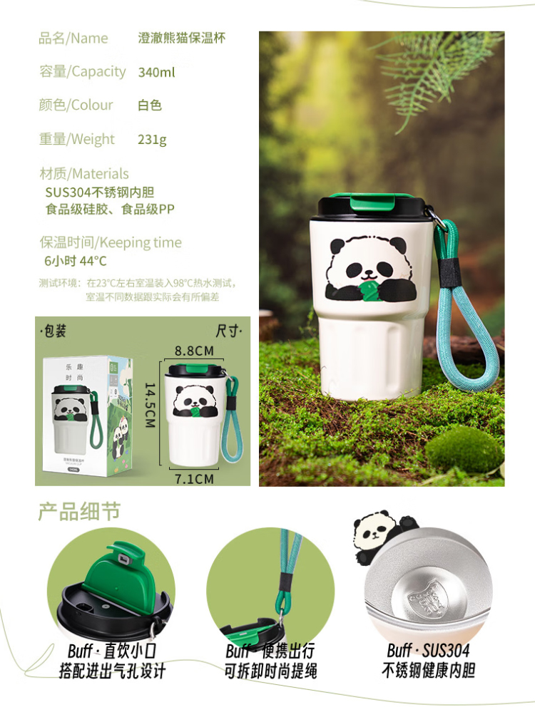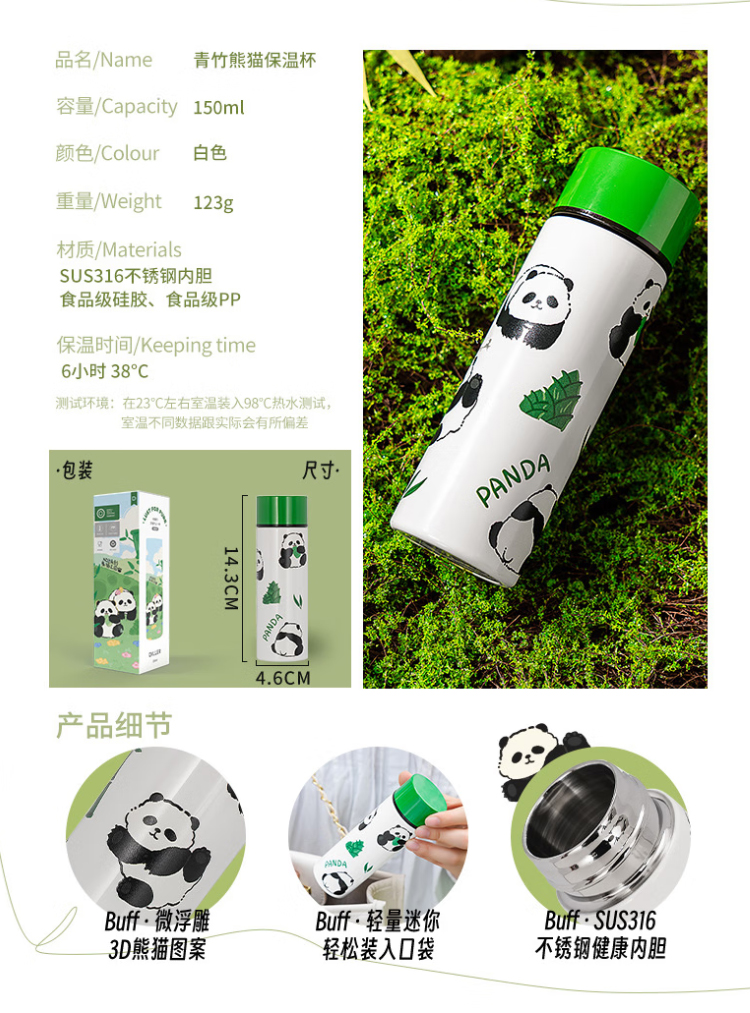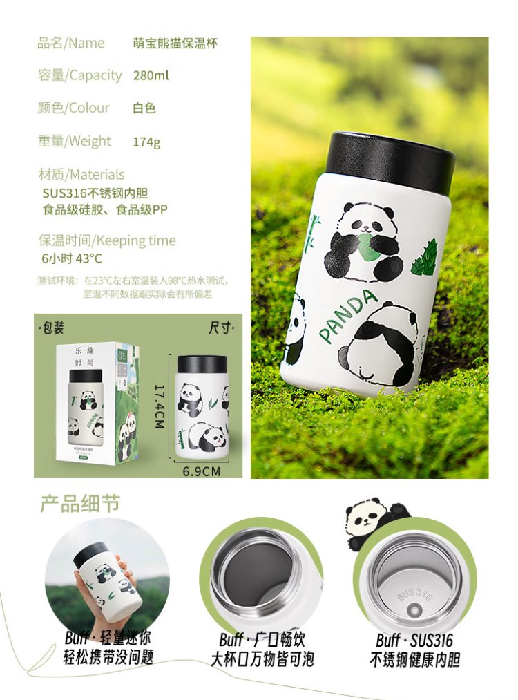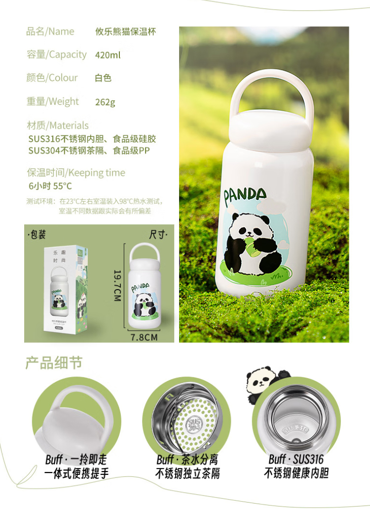 迪乐贝尔可爱熊猫系列周边纪念品伴手礼水杯316不锈钢便携提手保温杯