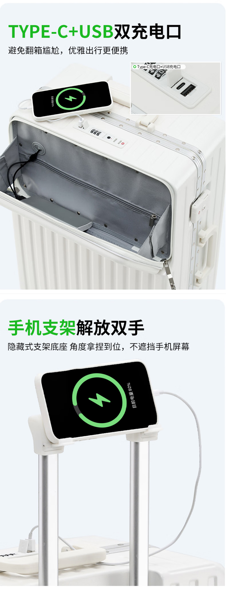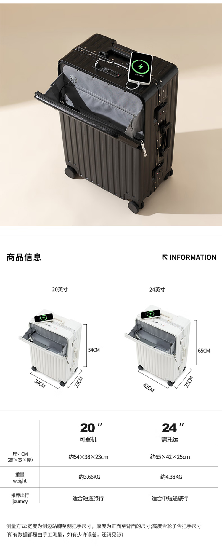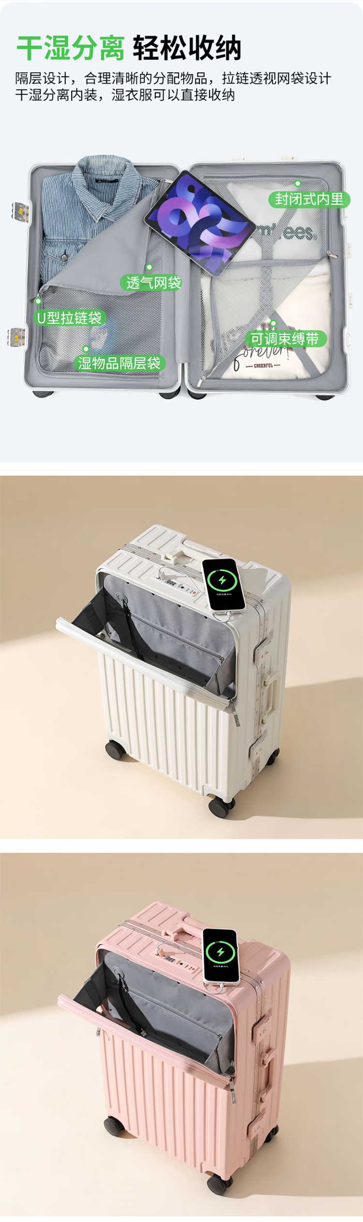 DULA铝框前开盖杯架行李箱拉杆箱USB旅行箱密码箱登机箱樱花粉20英寸