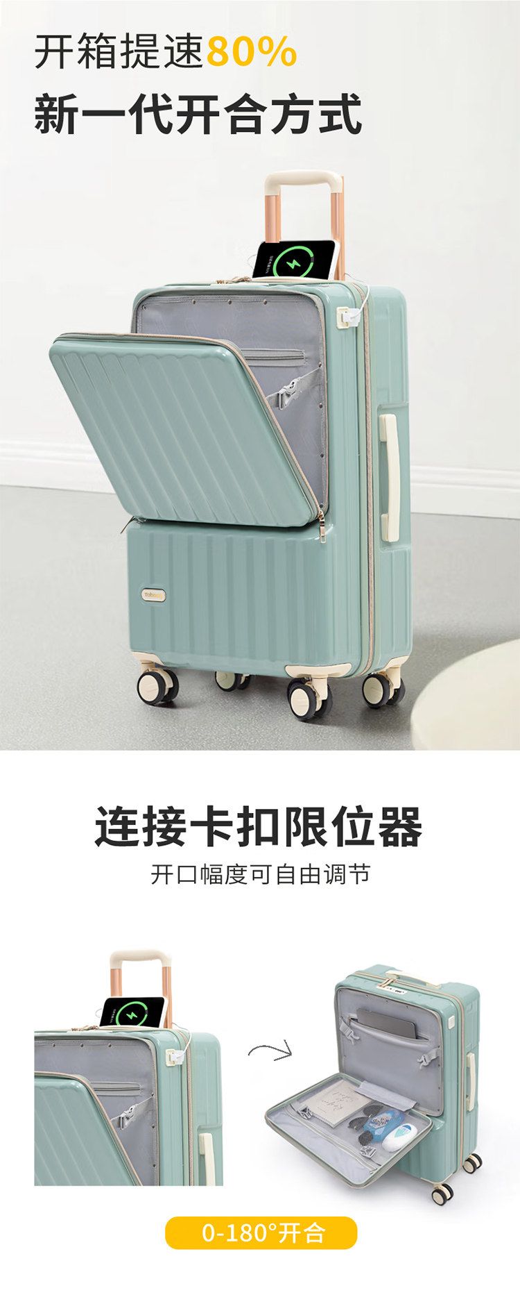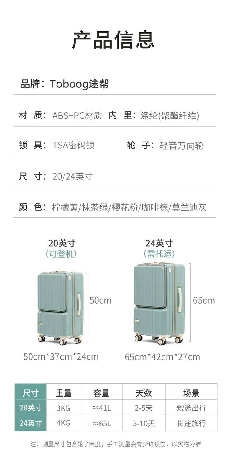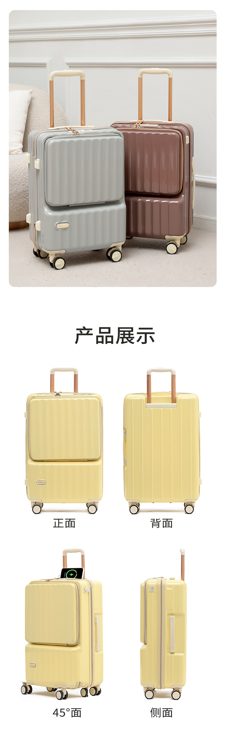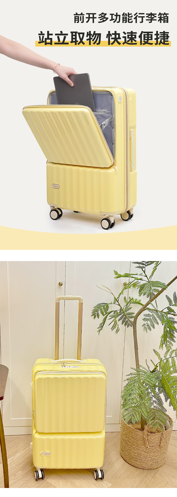 途帮(TOBOOG)前开口行李箱多功能TSA密码登机箱女轻音万向轮顺滑拉杆箱2109 柠檬黄 24英寸