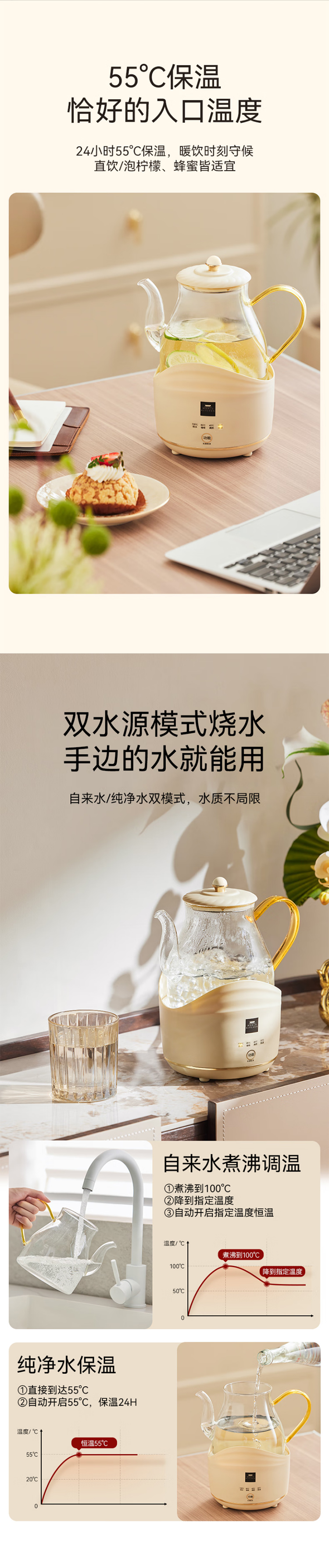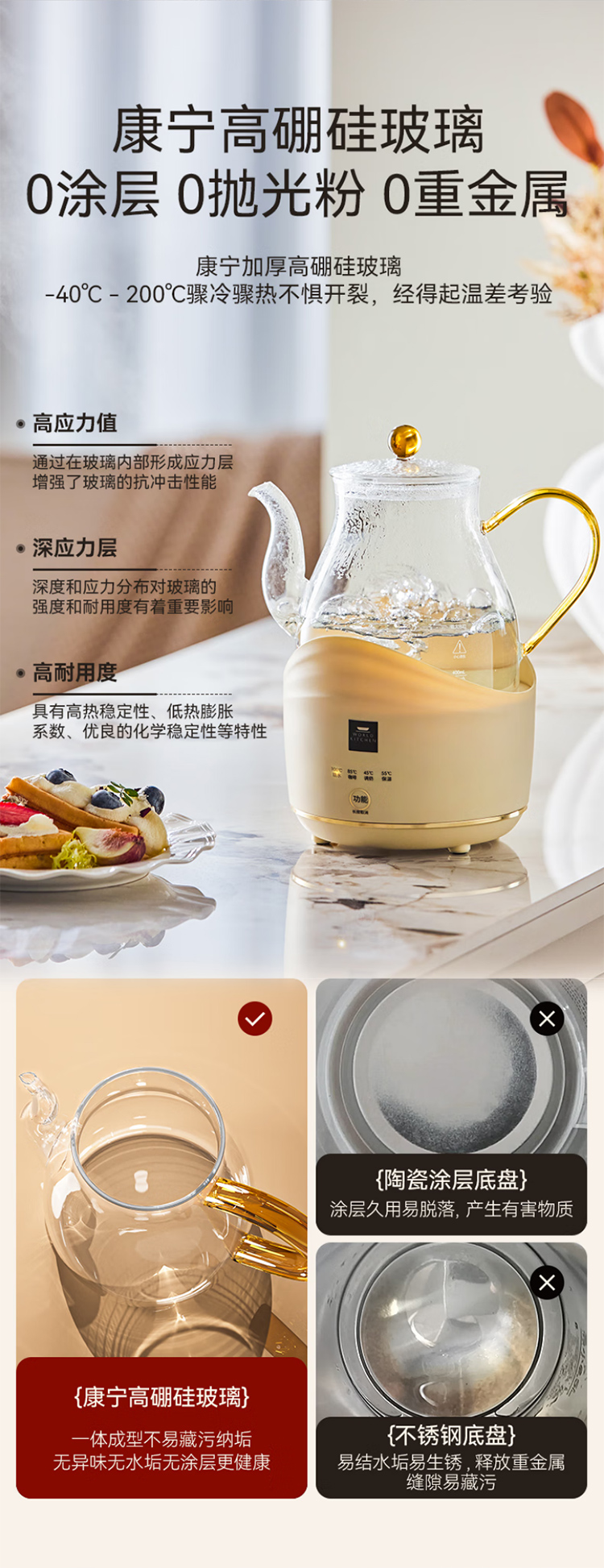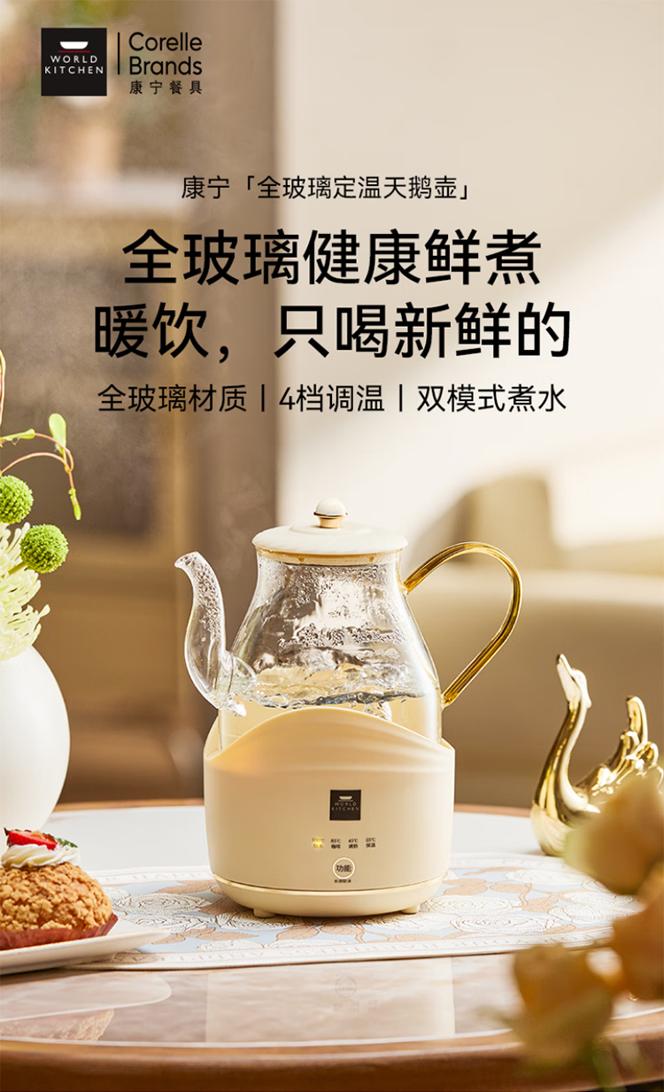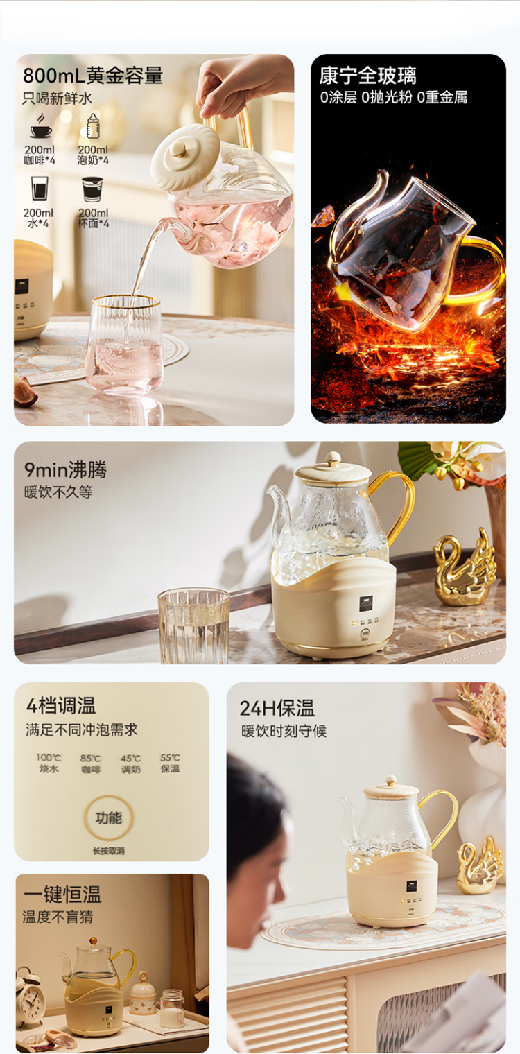 康宁全玻璃电热水壶电水壶0.8L 恒温家用烧水壶养生壶 办公室热牛奶保温壶烧水壶 0.8