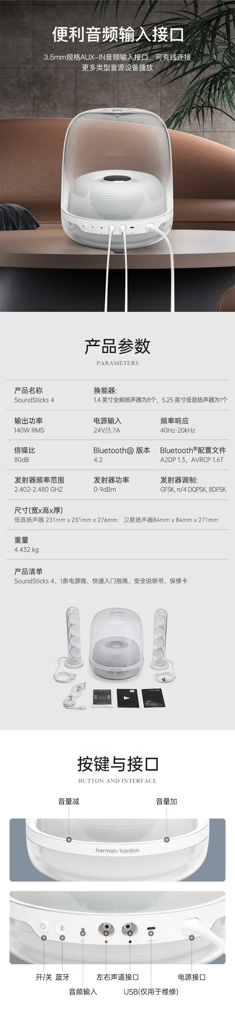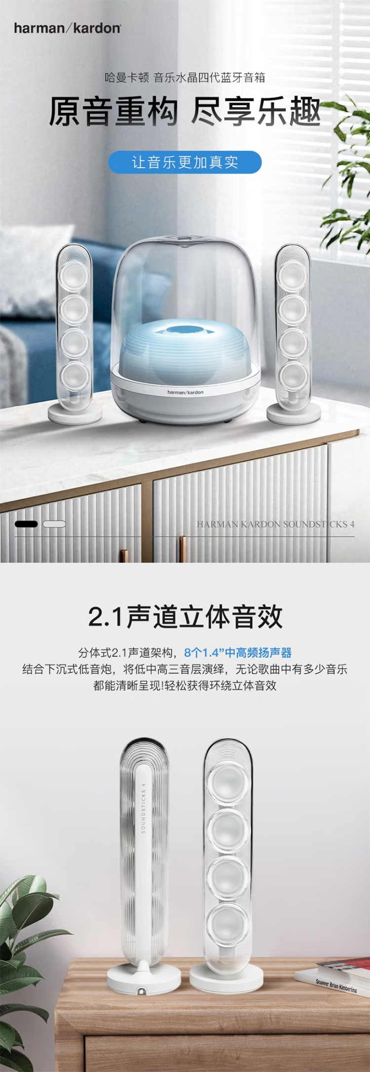 哈曼卡顿水晶4代桌面蓝牙音箱 电脑通用双声道 Soundsticks4 电脑音箱桌面蓝牙音箱氛围灯音响生日礼物 水晶4