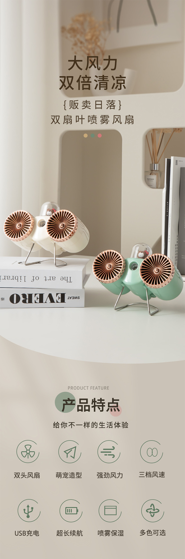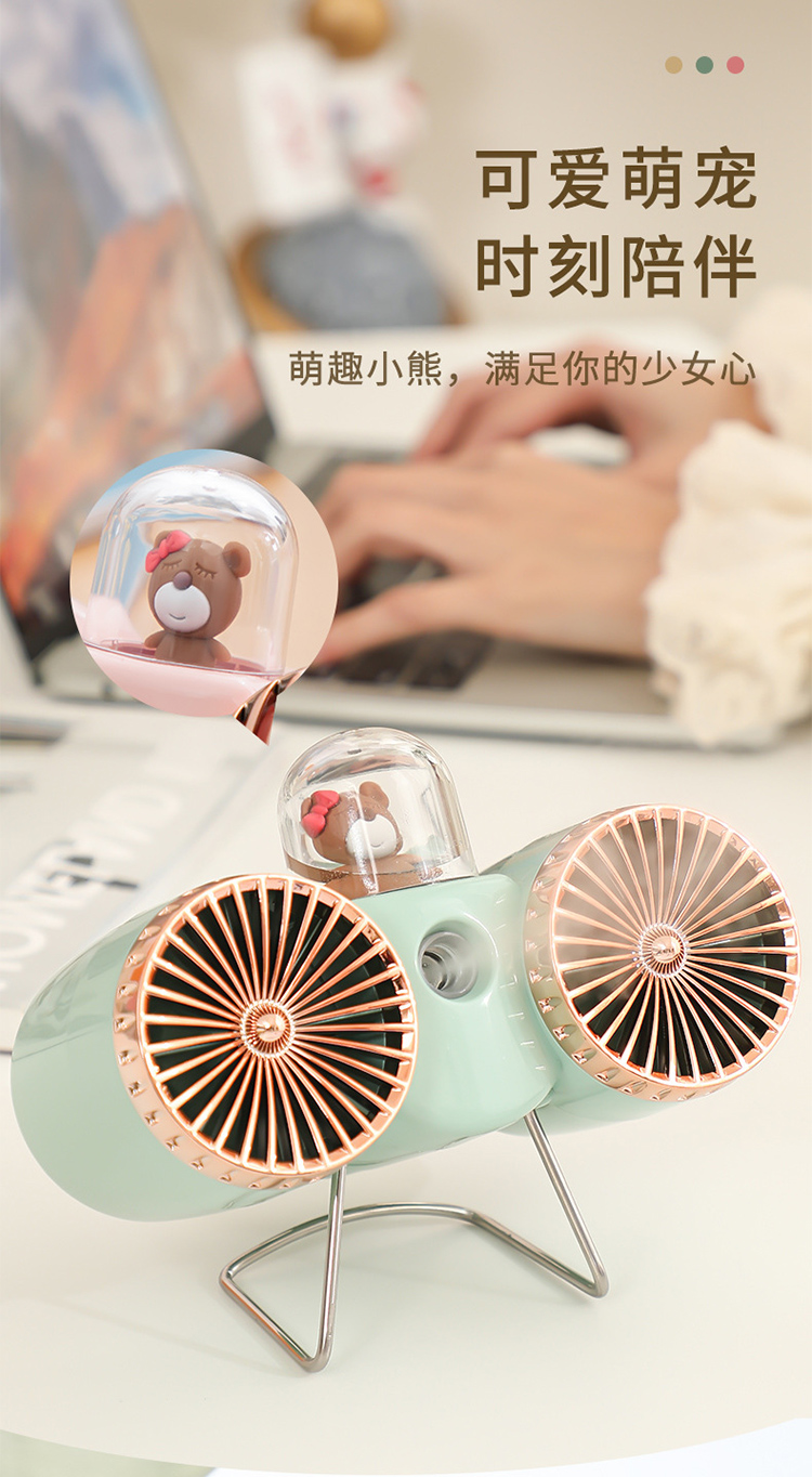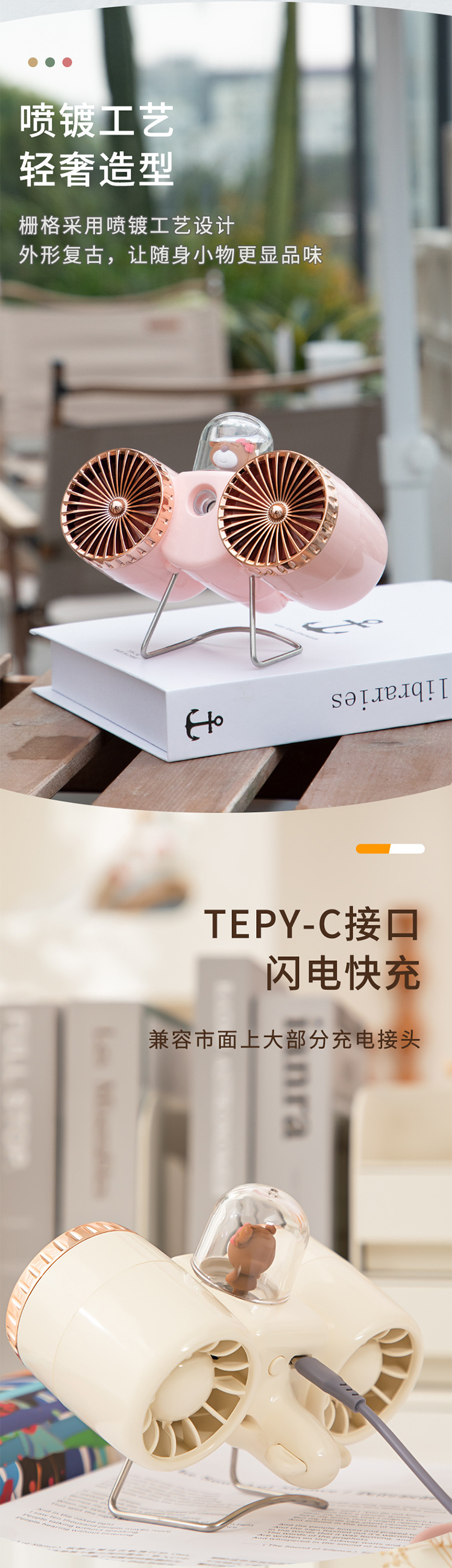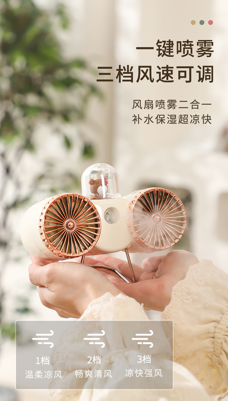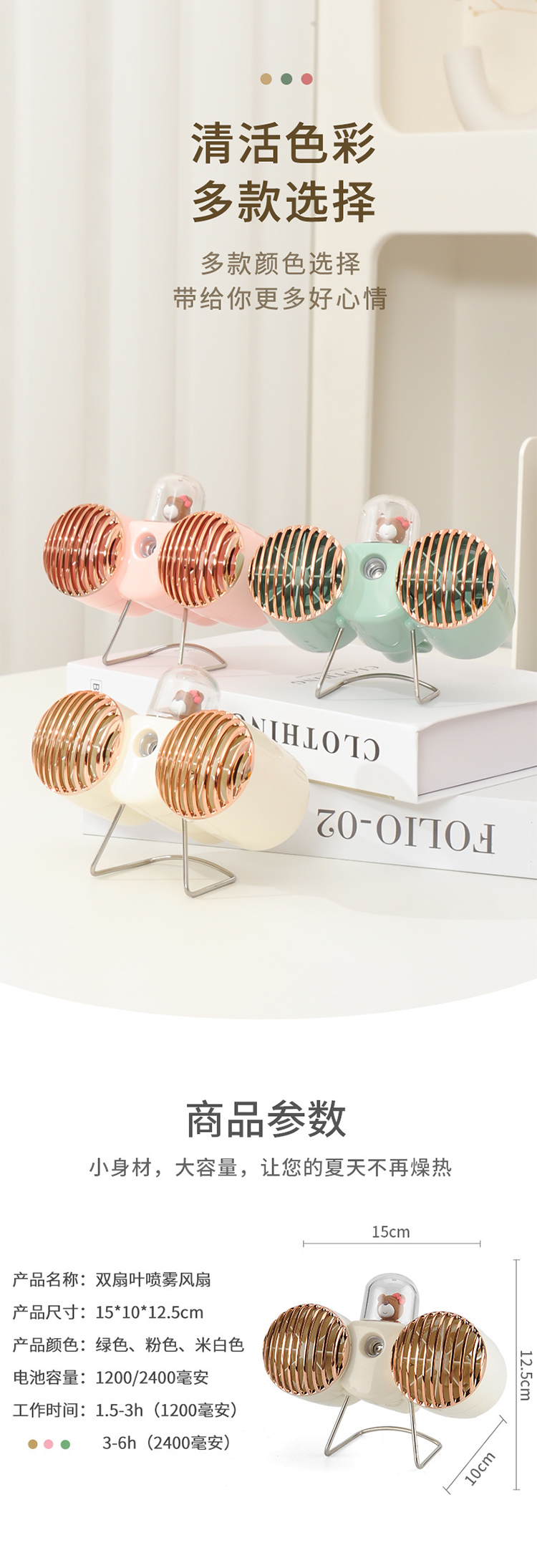 新款复古双扇叶喷雾保湿小风扇USB充电居家办公桌面喷雾2合1风扇