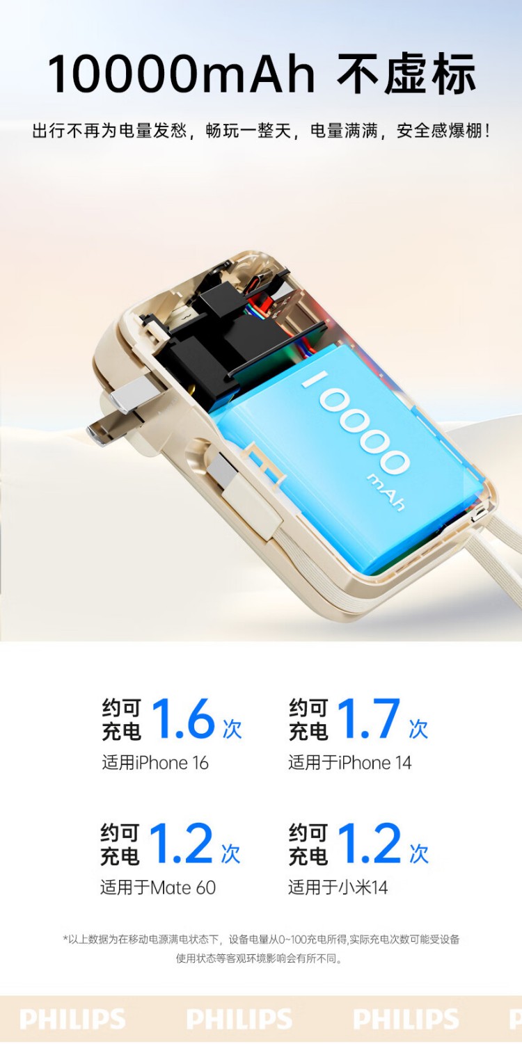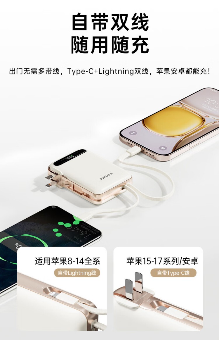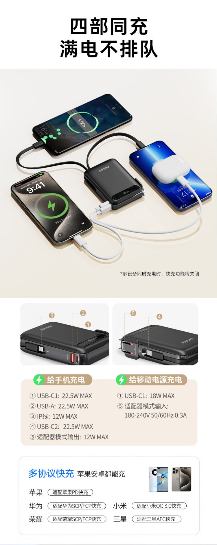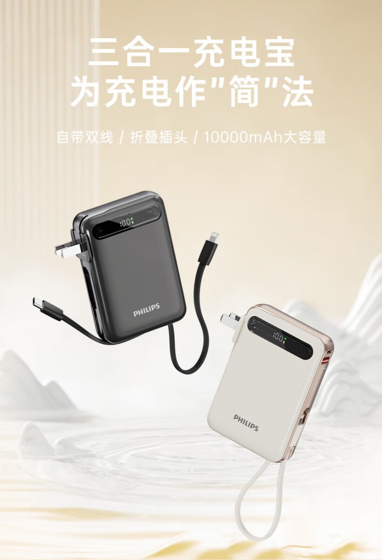 年会飞利浦三合一充电宝3C认证可上飞机移动电源自带双线插头10000毫安小巧便携22.5W快充大容量