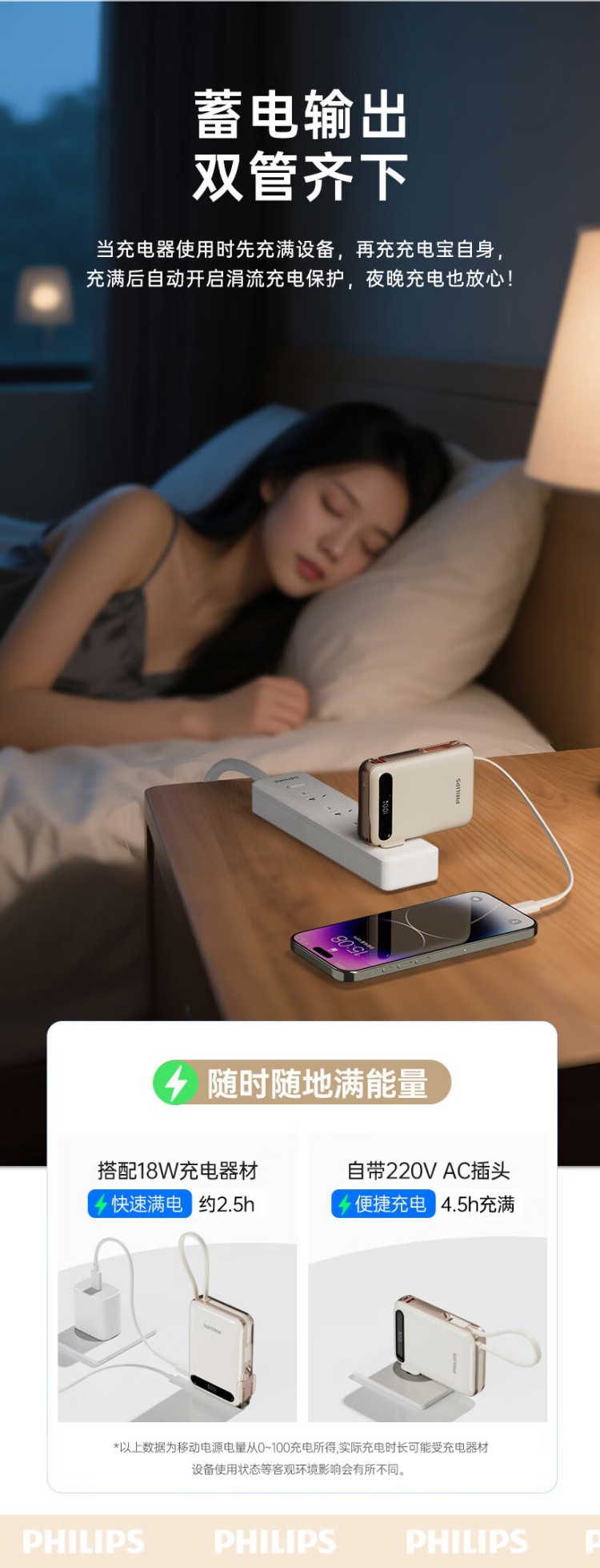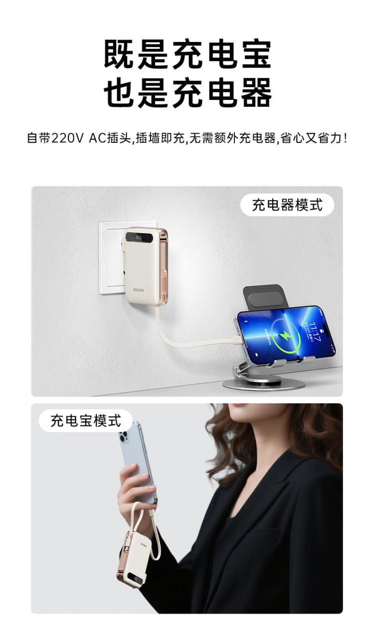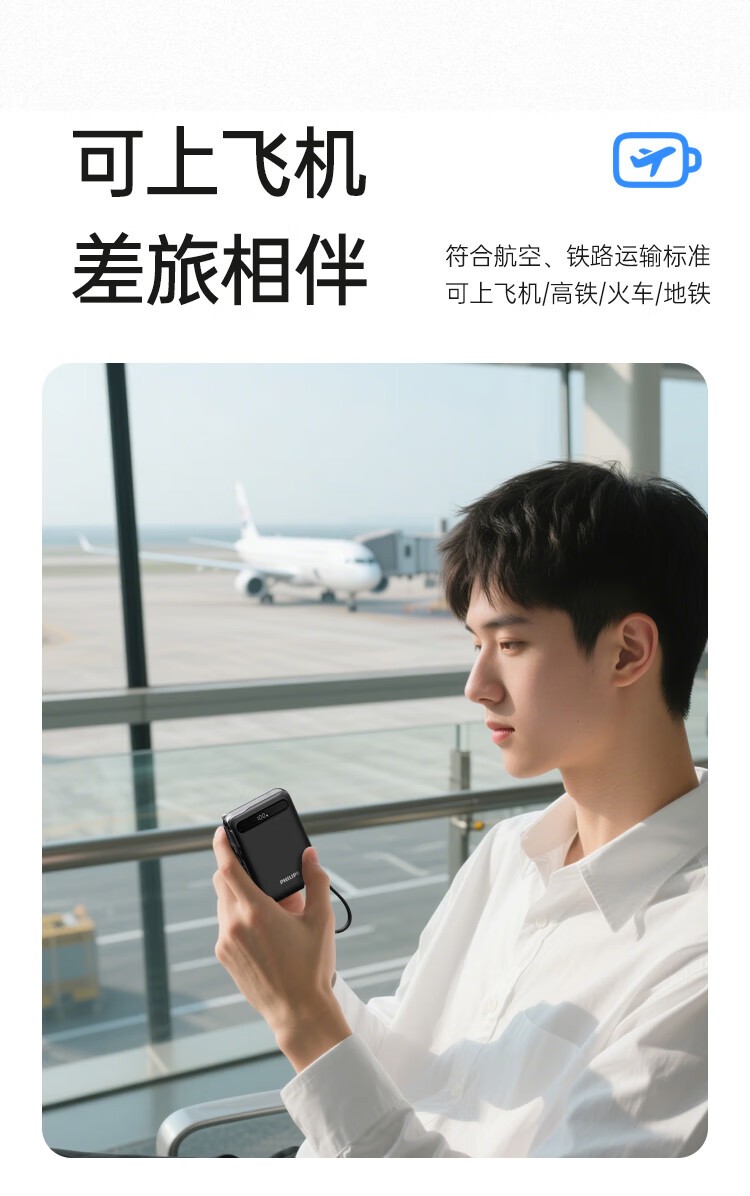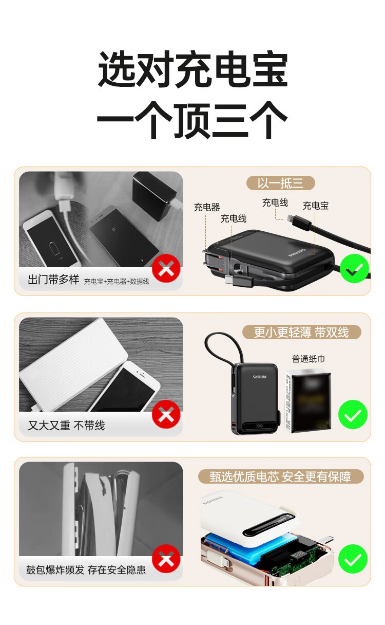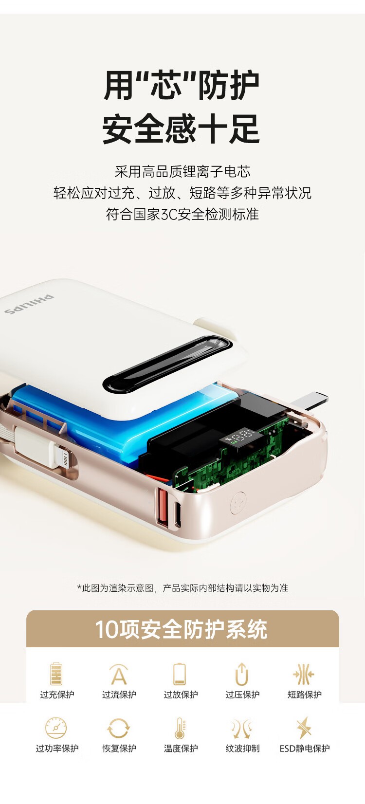年会飞利浦三合一充电宝3C认证可上飞机移动电源自带双线插头10000毫安小巧便携22.5W快充大容量