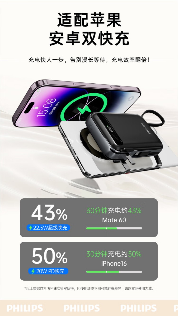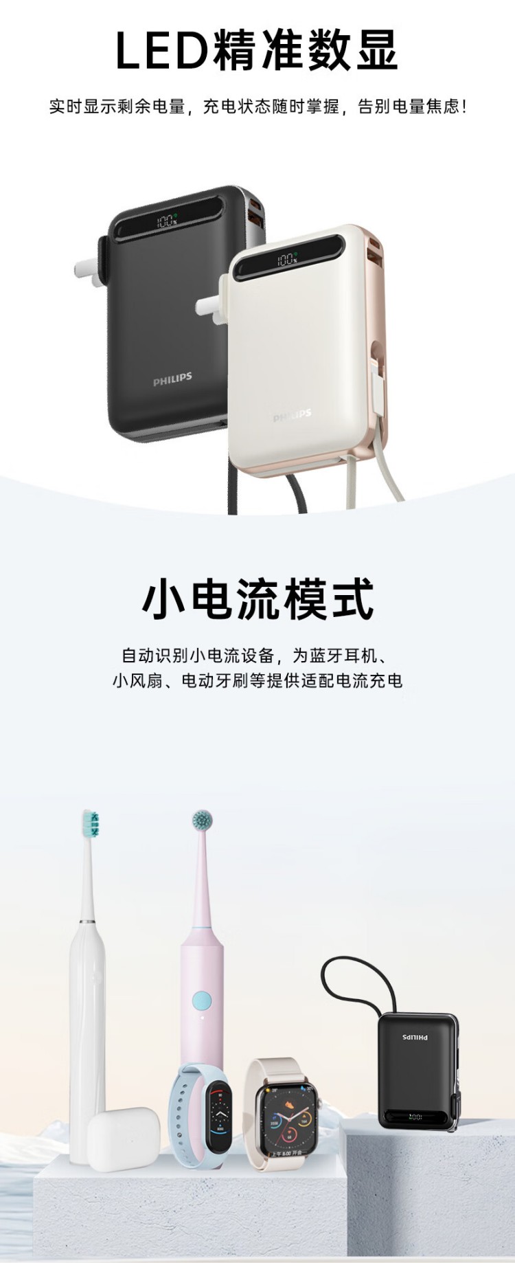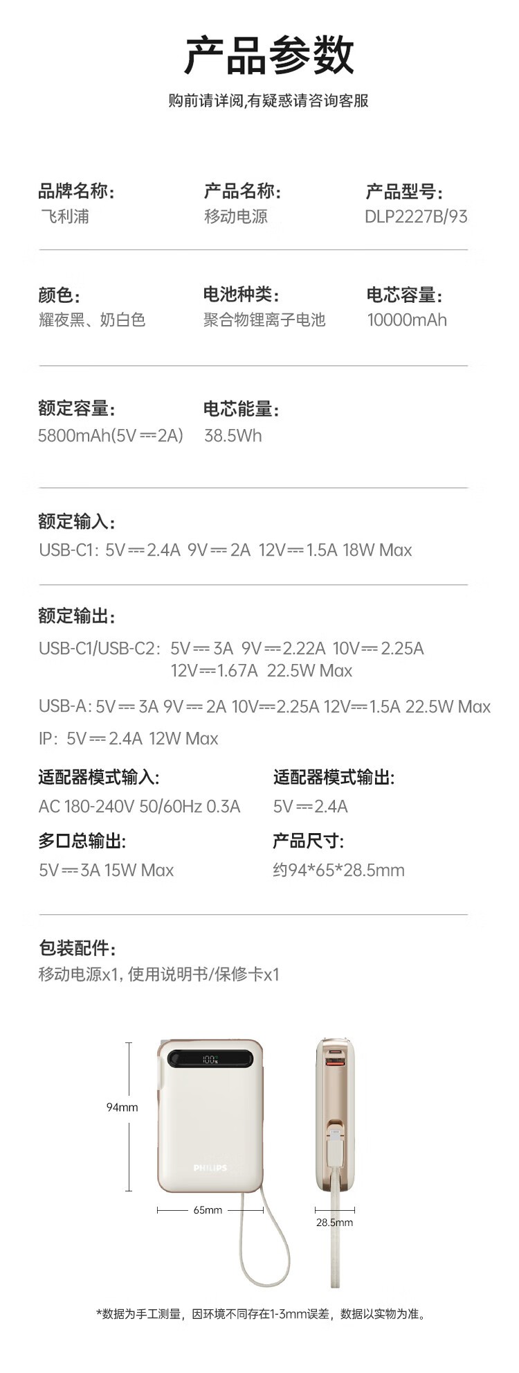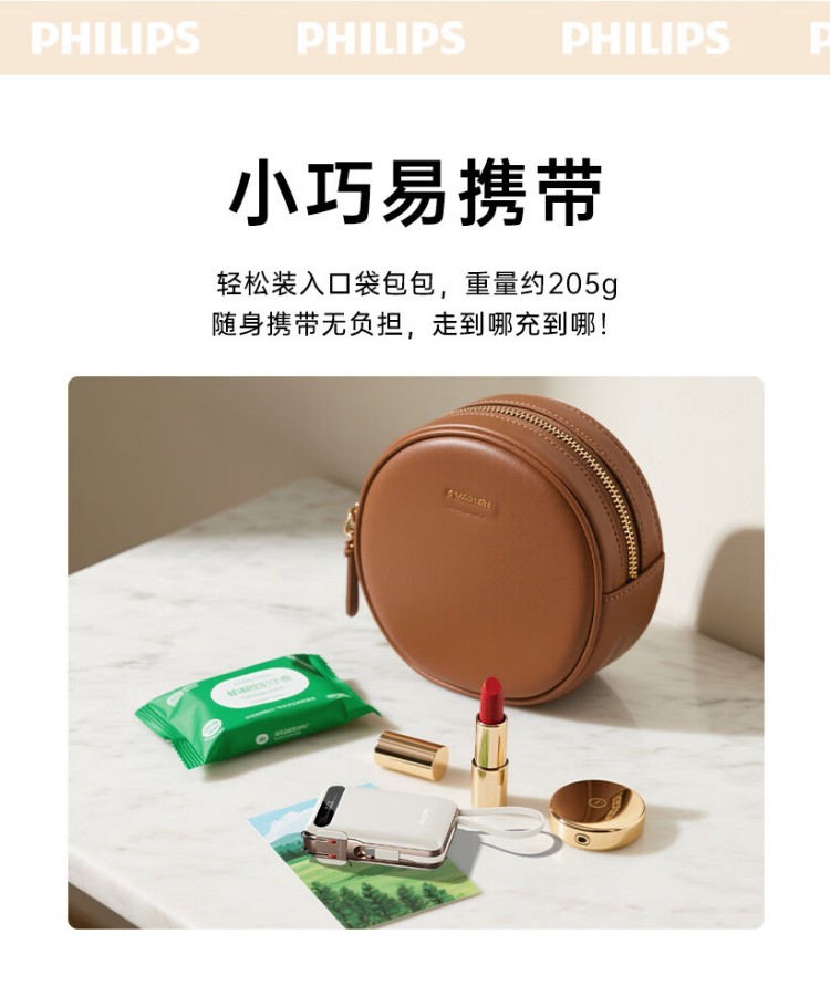 年会飞利浦三合一充电宝3C认证可上飞机移动电源自带双线插头10000毫安小巧便携22.5W快充大容量