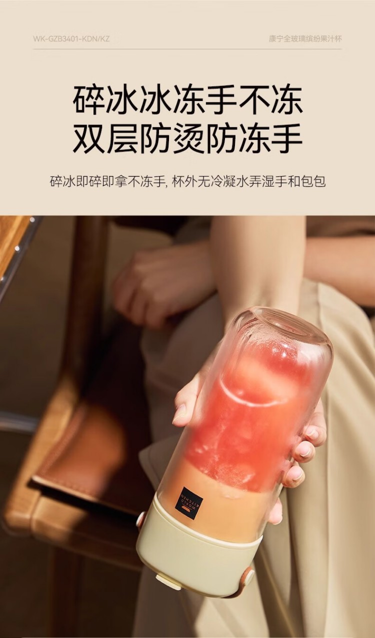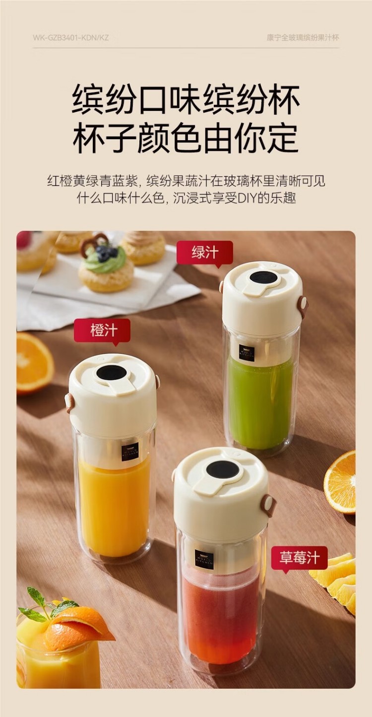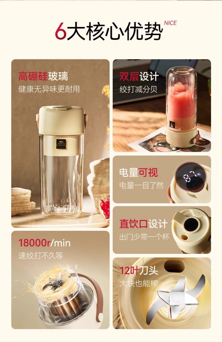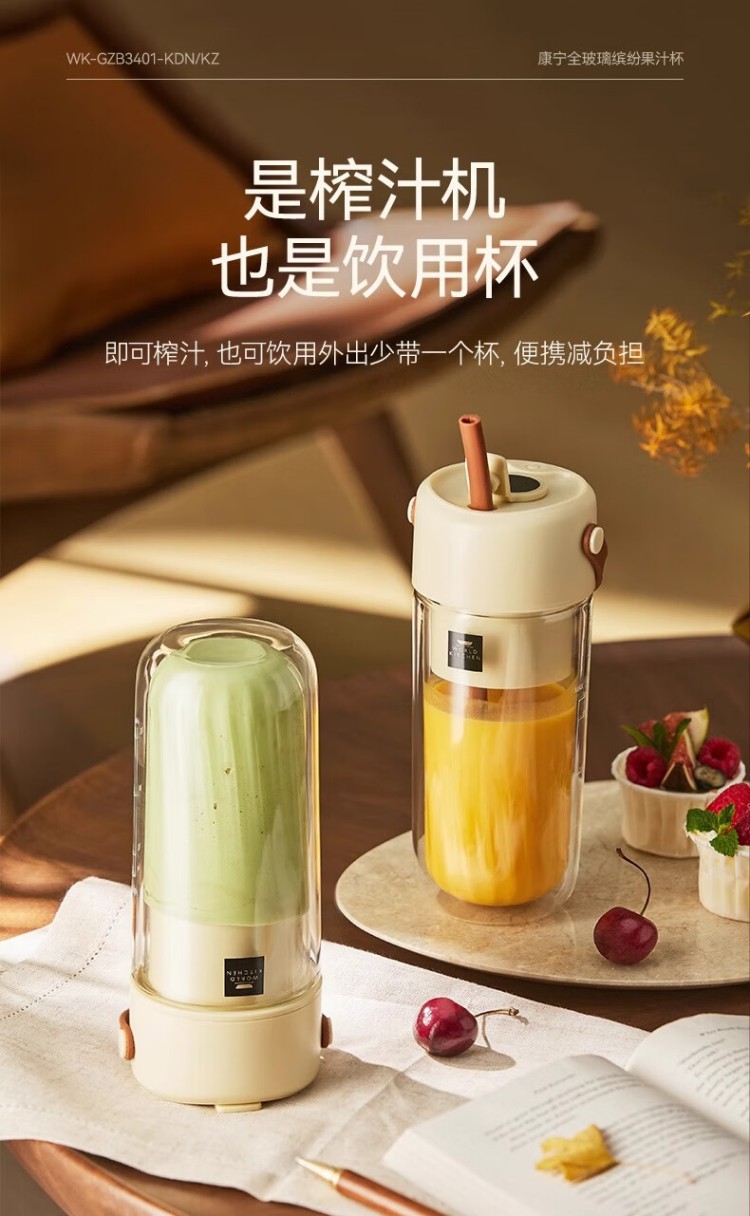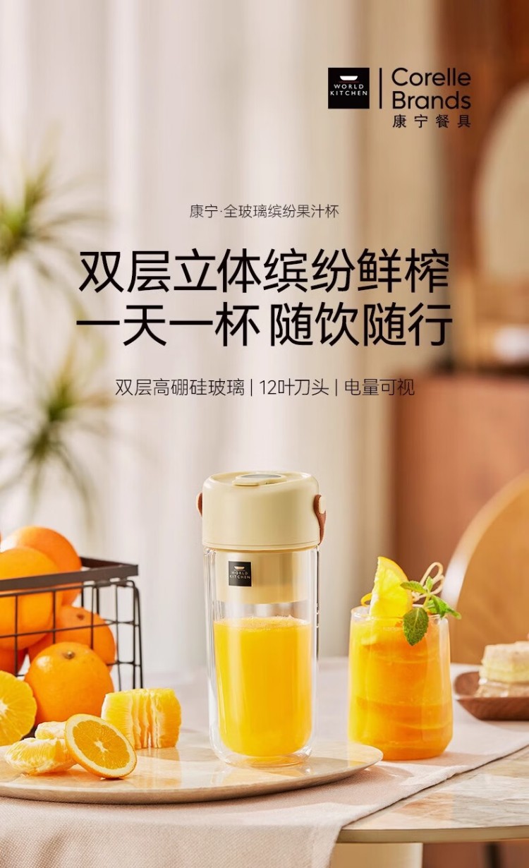 年会康宁榨汁机 充电果汁杯双层玻璃杯身12叶304不锈钢刀头小型旅行便携榨汁杯多功能搅拌杯