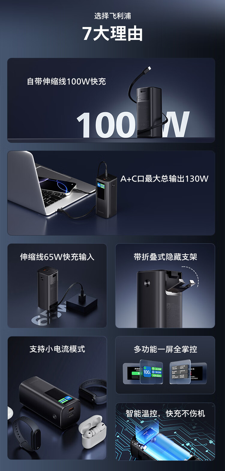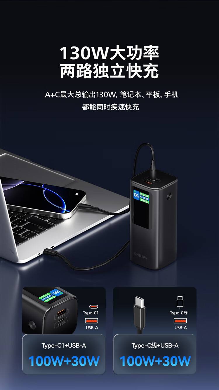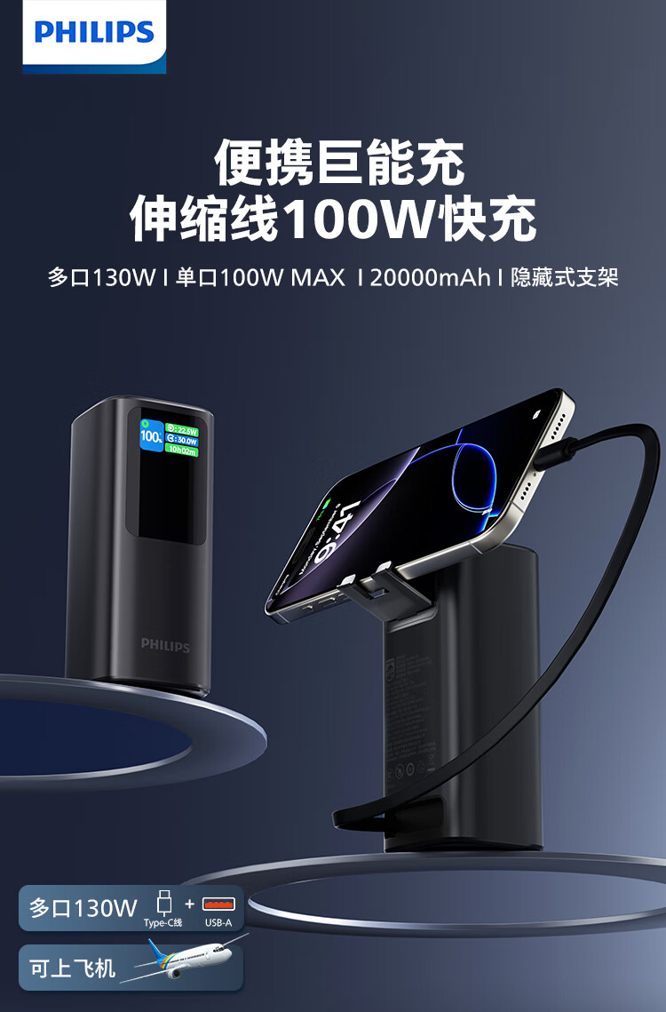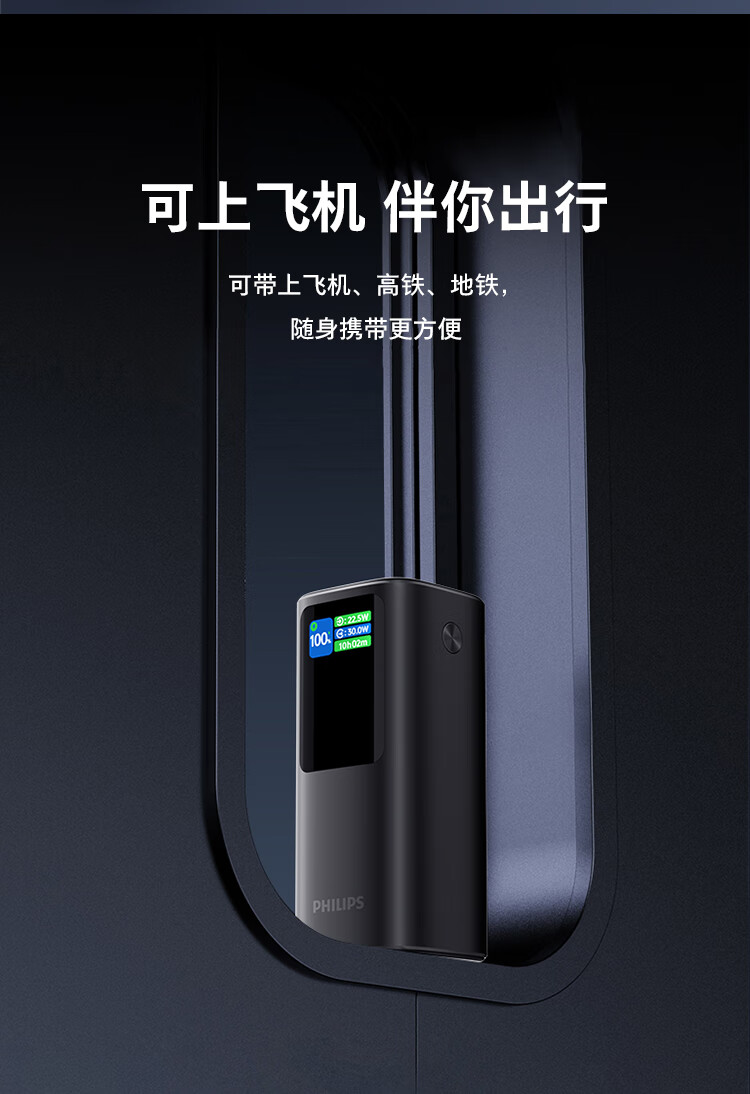 年终飞利浦100W充电宝20000毫安国标3c认证可带上飞机130W超级快充移动电源