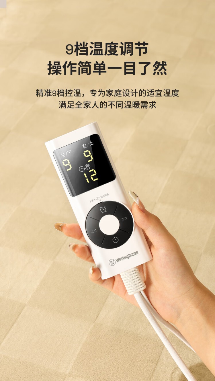 西屋(Westinghouse)电热毯双人九档双温双控除螨家用加热电褥子恒温安全断电速热定时 【双控+除螨+可水洗】