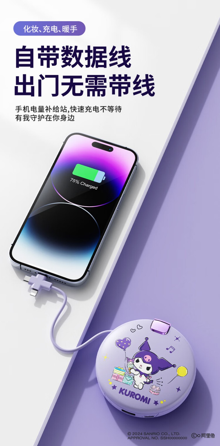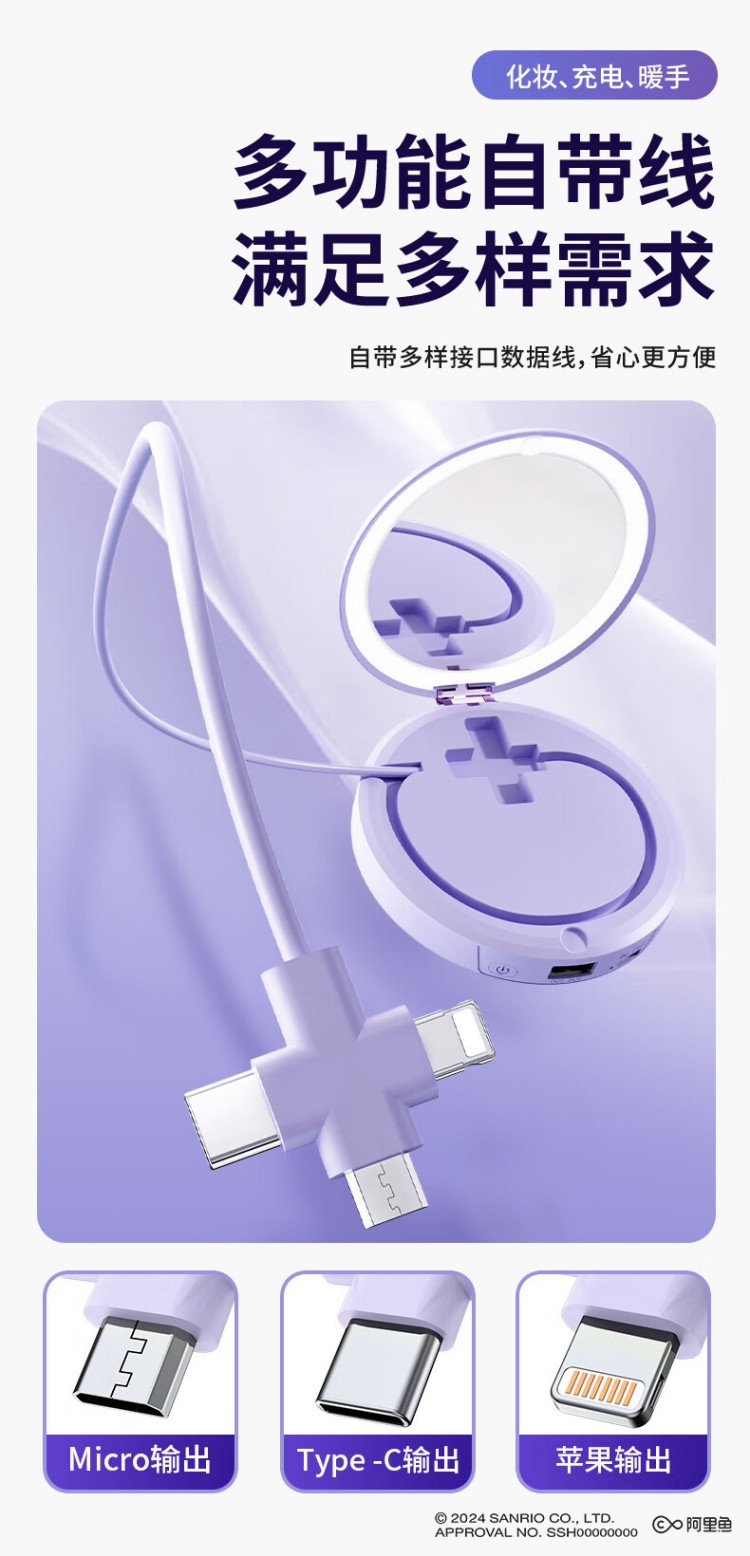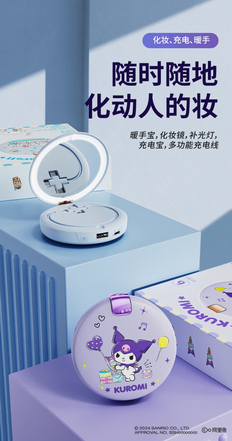 大耳狐(BIGEARFOX)【三丽鸥授权】自带线充电宝暖手宝化妆镜四合一便捷式应急移动电源可折叠随身LED补光灯 库洛米