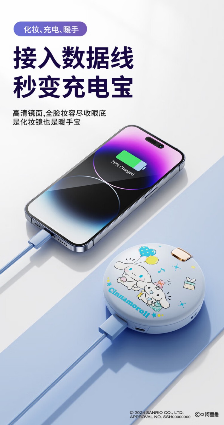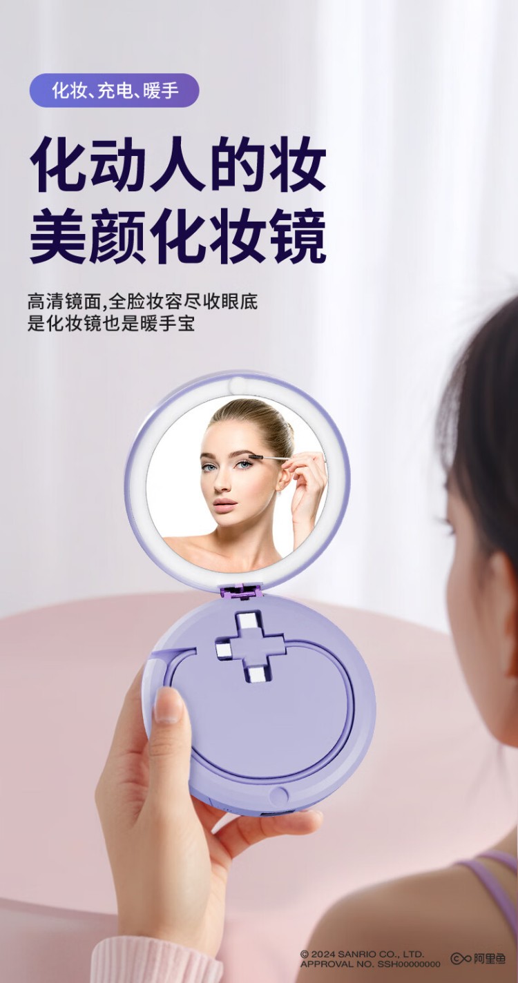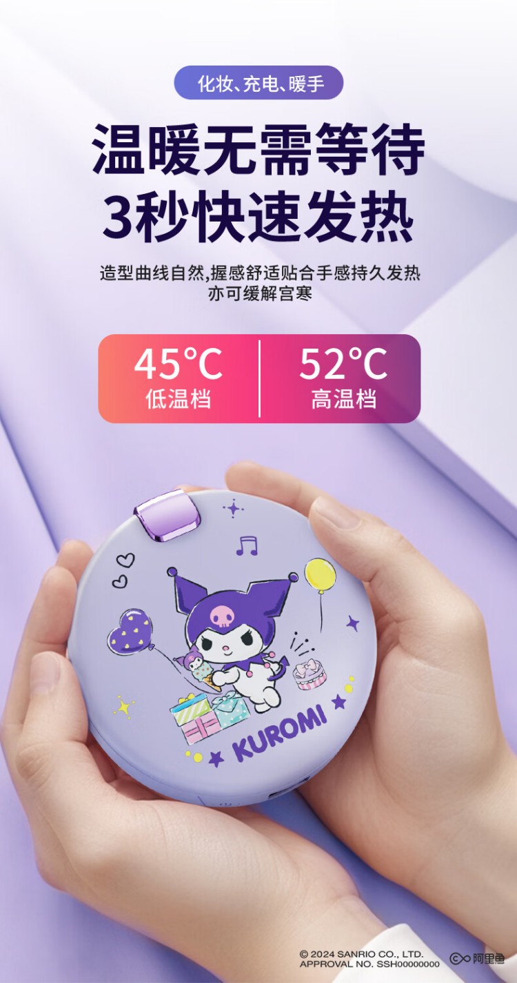 大耳狐(BIGEARFOX)【三丽鸥授权】自带线充电宝暖手宝化妆镜四合一便捷式应急移动电源可折叠随身LED补光灯 库洛米