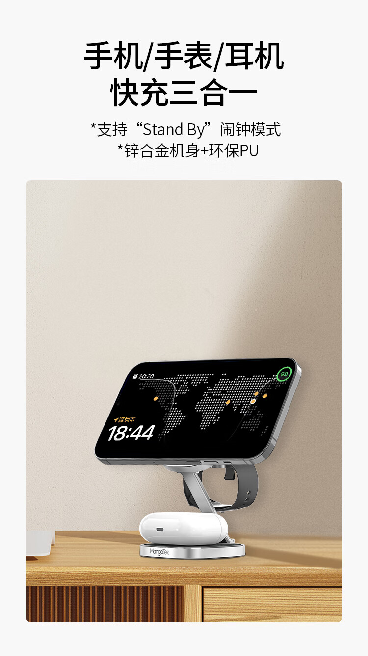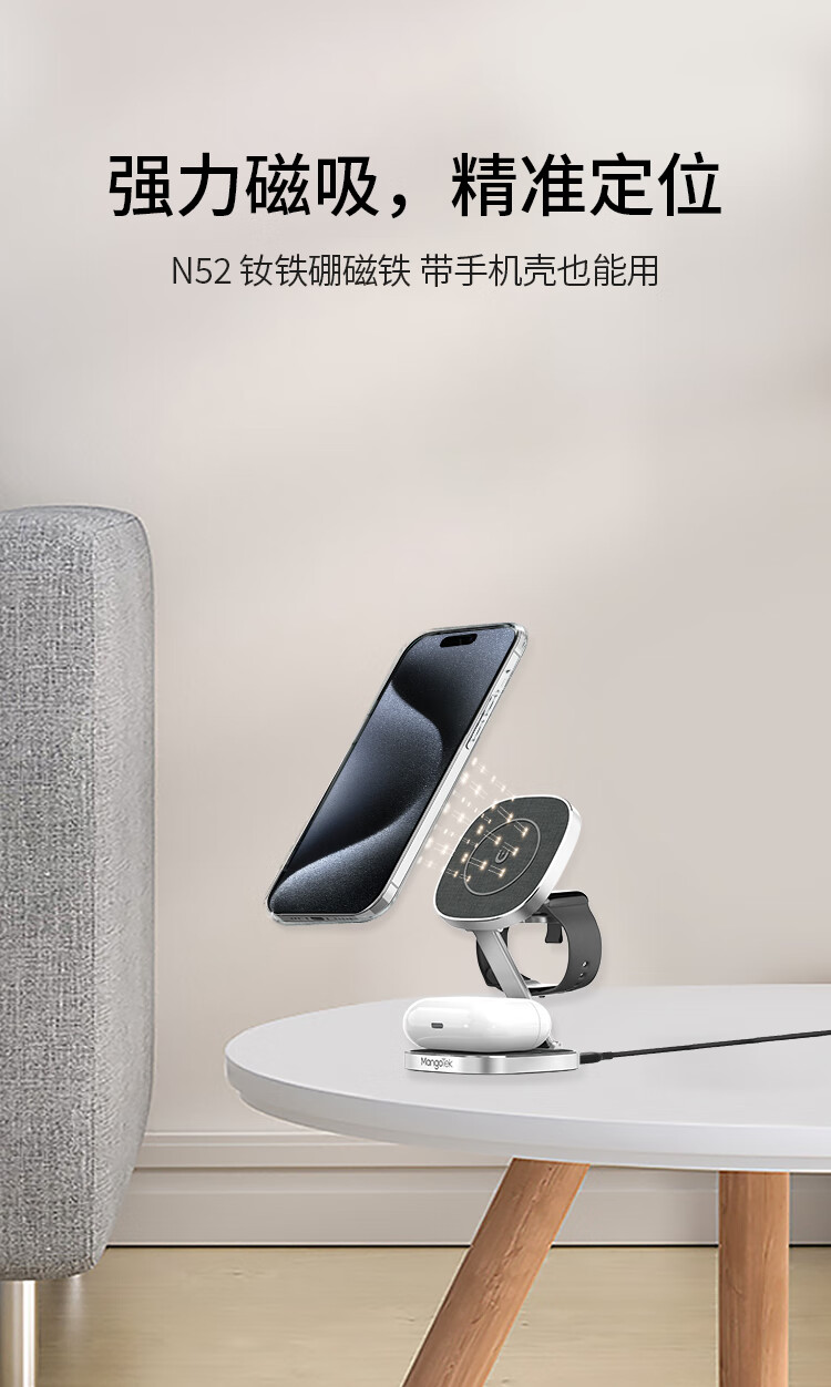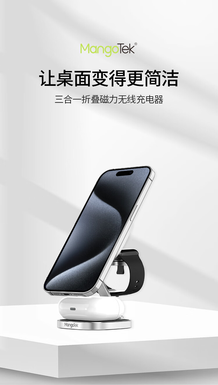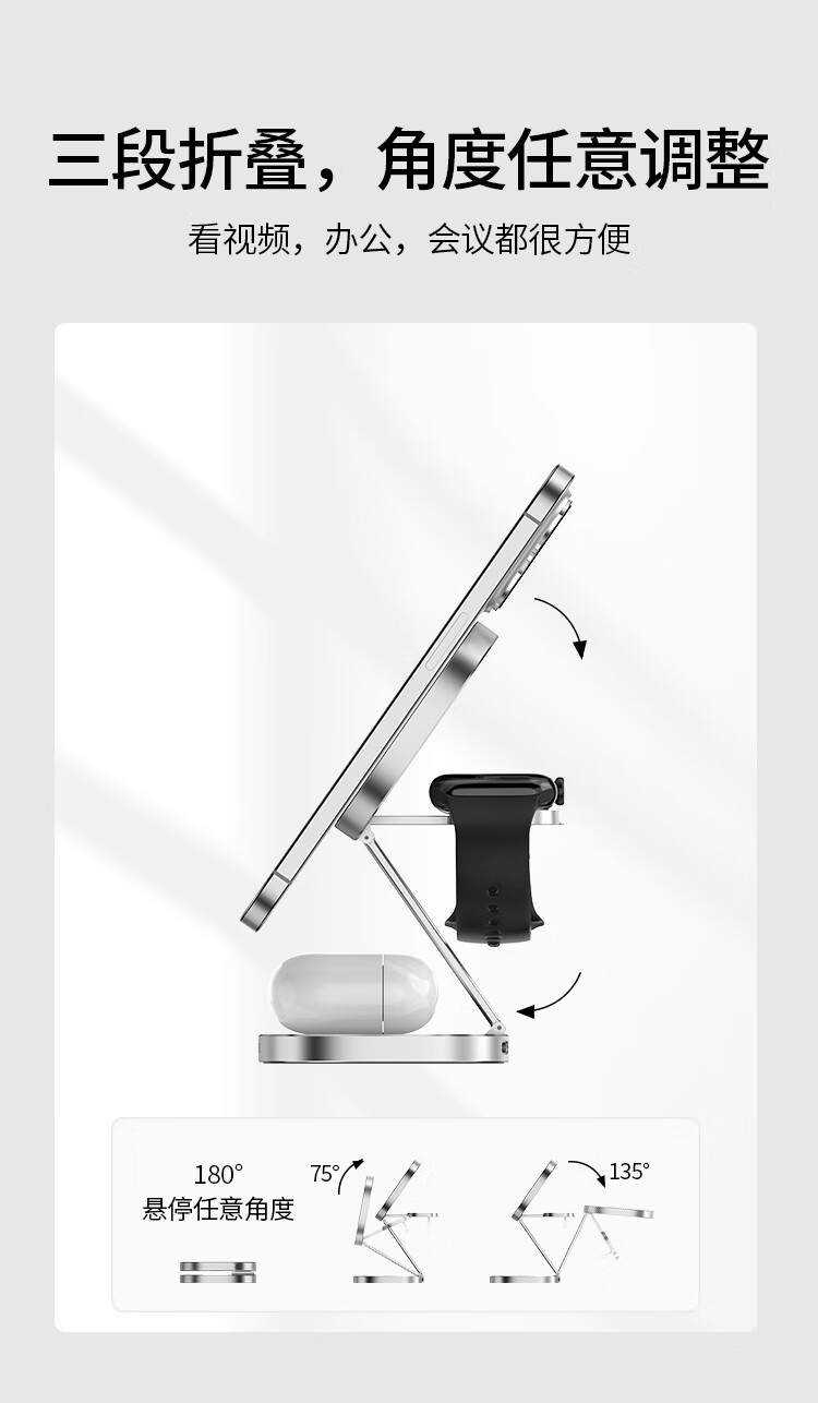 磁吸无线充电器15W苹果手机手表耳机三合一折叠支架便携适用iPhone15/iWatch/AirPods Pro 银色
