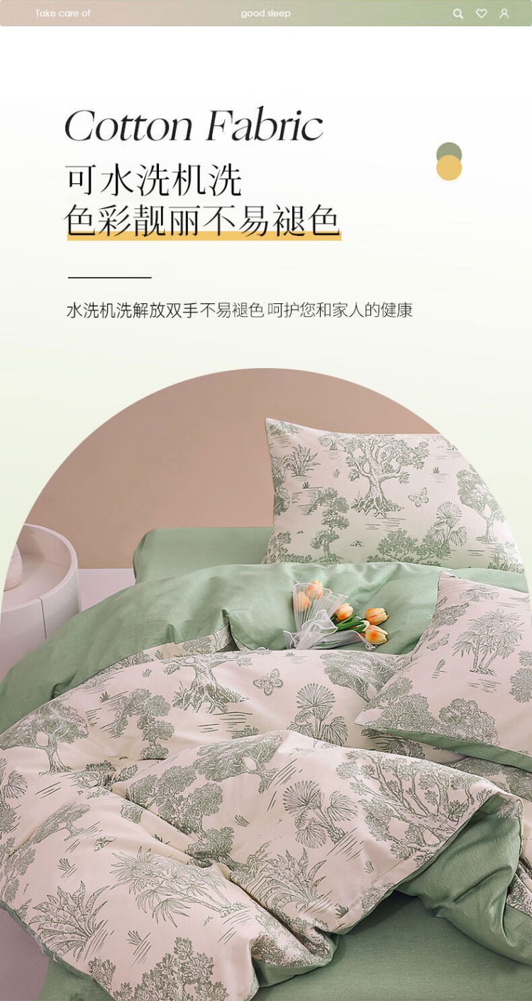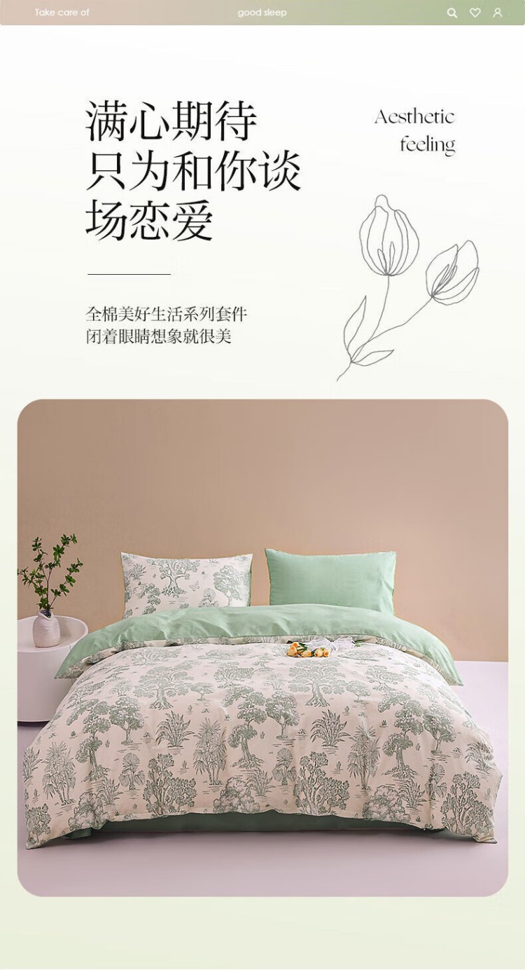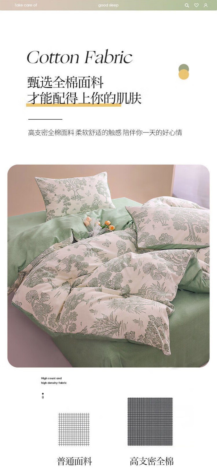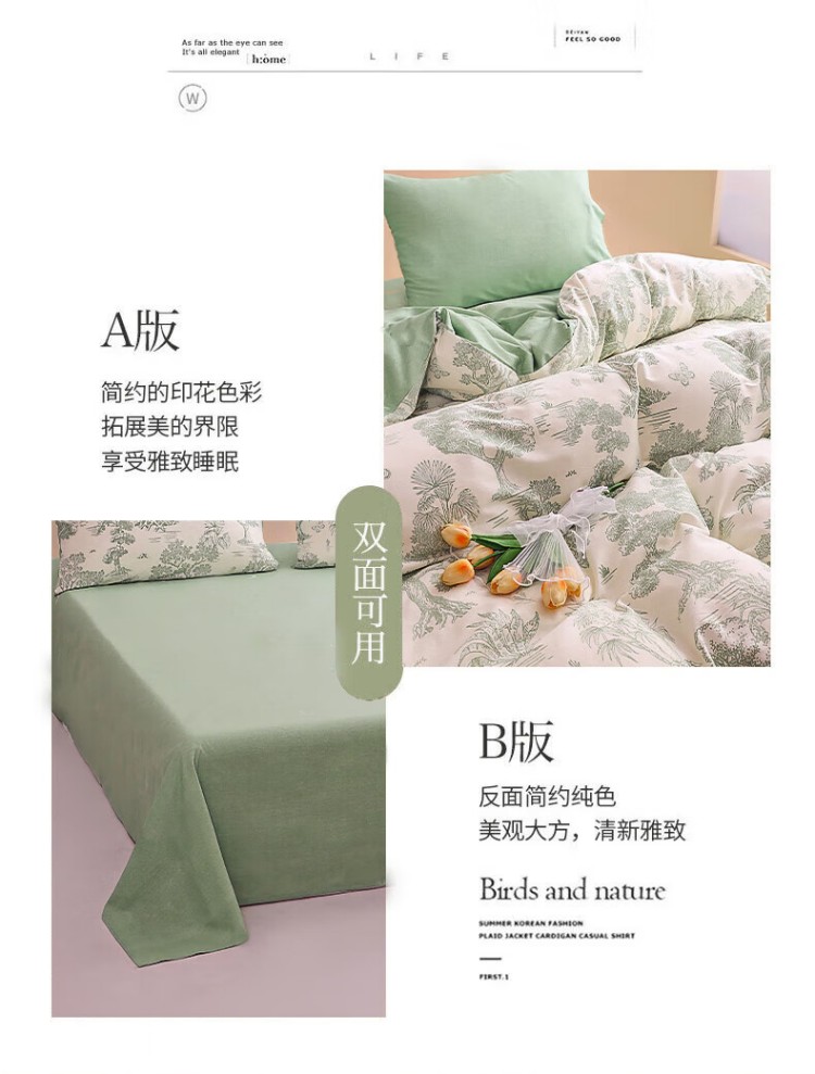 洁丽雅100%纯棉四件套学生宿舍床单三件套卧室全棉被套套件 千寻绿【抗菌A类全棉】 四件套 床单款 适合200*230
