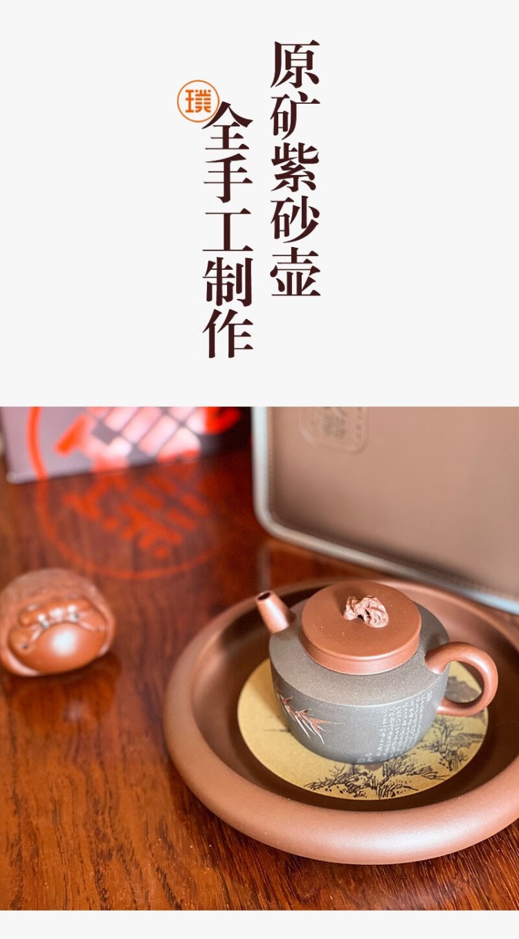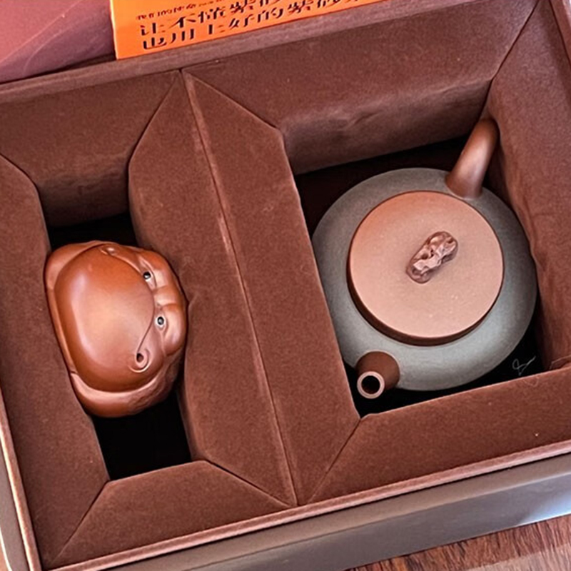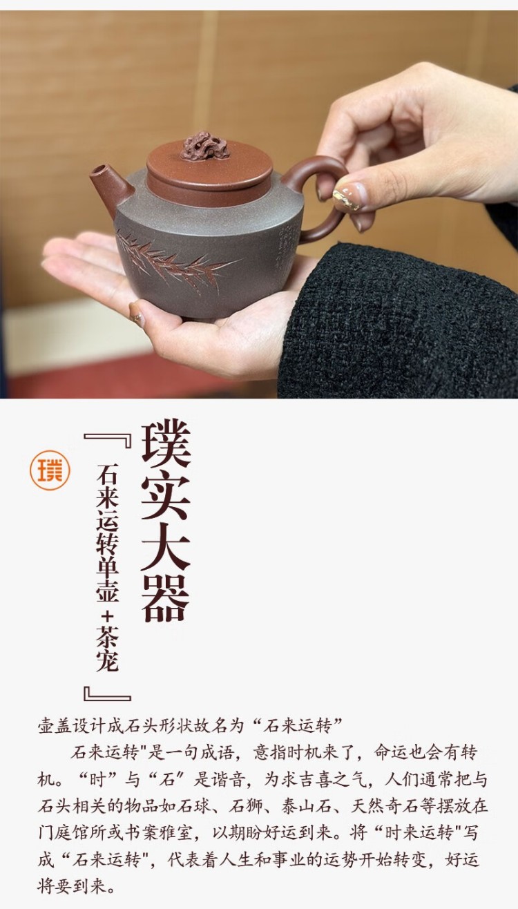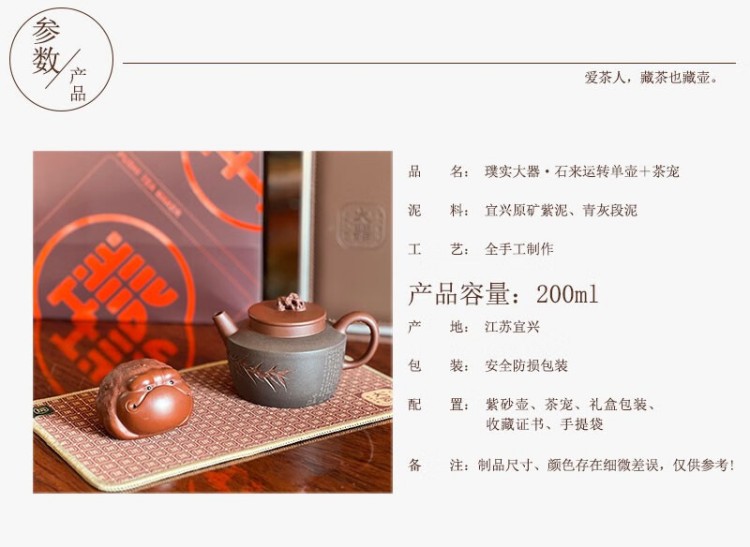 壶体字体绘图全手工雕刻宜兴原矿紫泥、青灰段泥璞实大器·石来运转单壶+茶宠