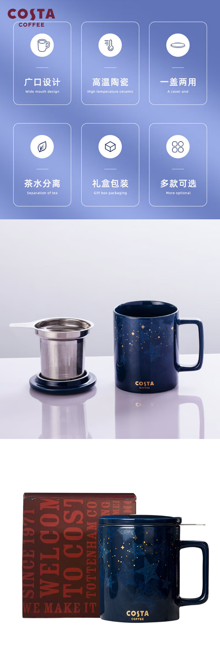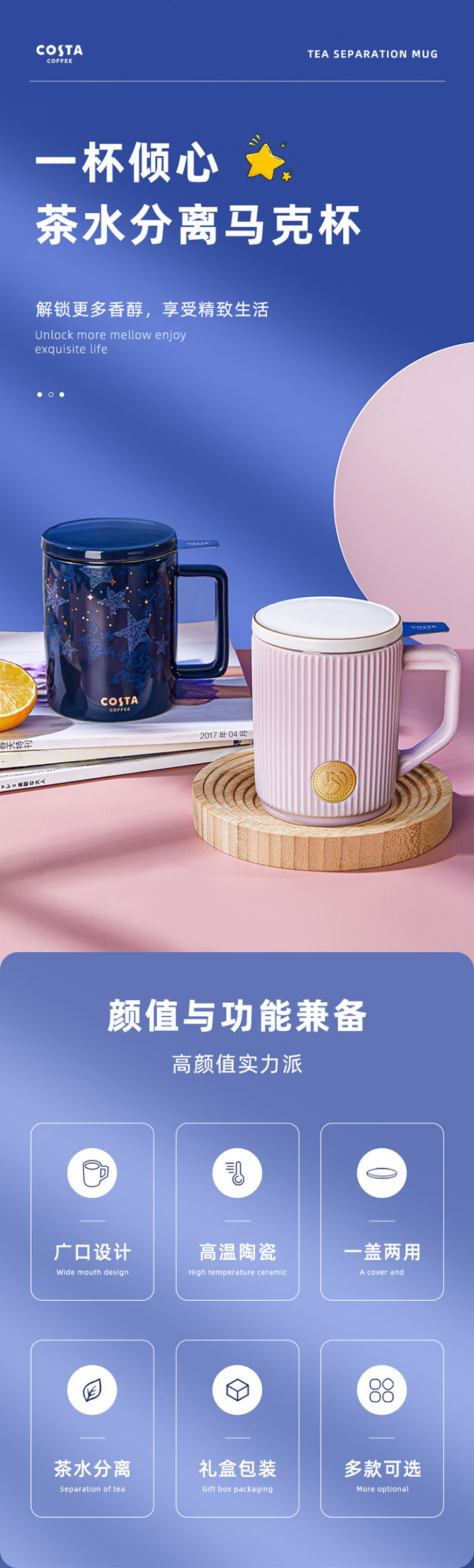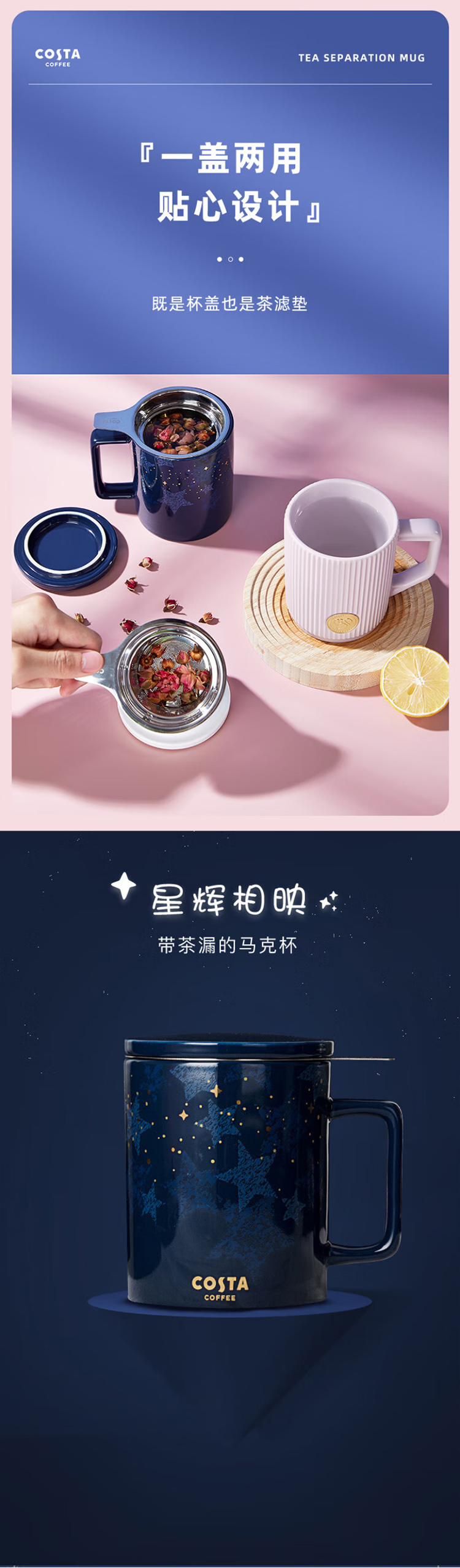 COSTA茶水分离陶瓷马克杯带盖带茶虑大容量杯子