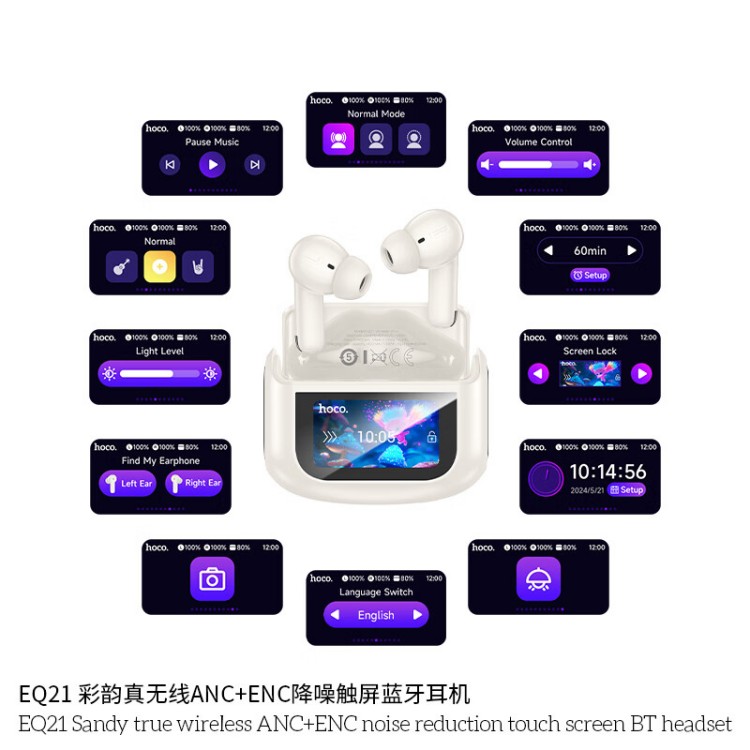 EQ21【自带彩屏】ANC+ENC降噪耳机 真无线触屏蓝牙耳机 超长续航无线耳机 适用苹果华为小米 【蓝色】 自带触摸屏幕 蓝牙V5.4无线耳机