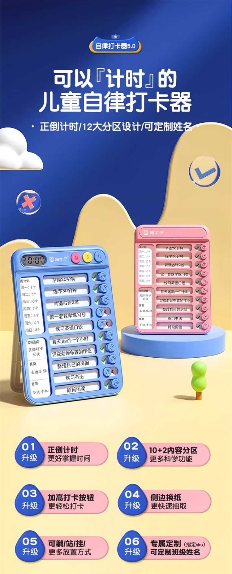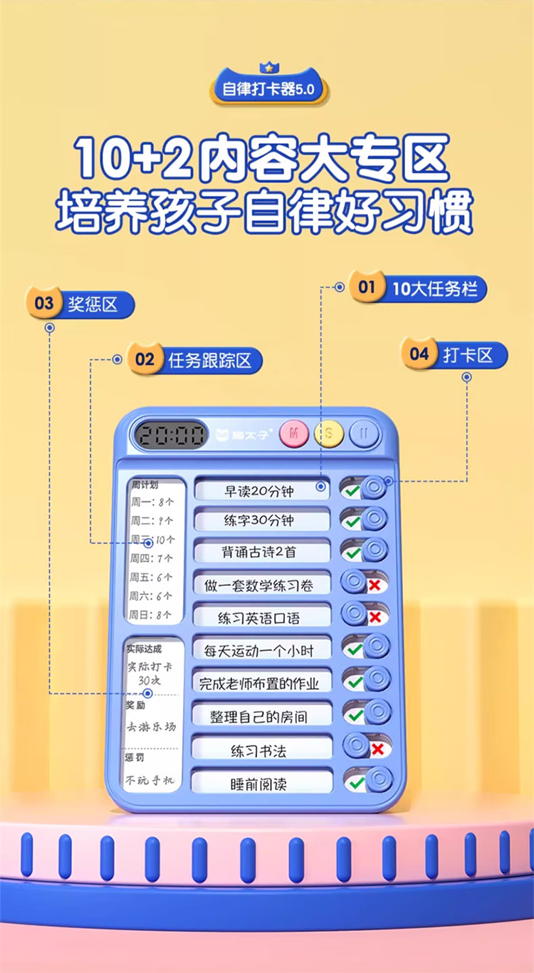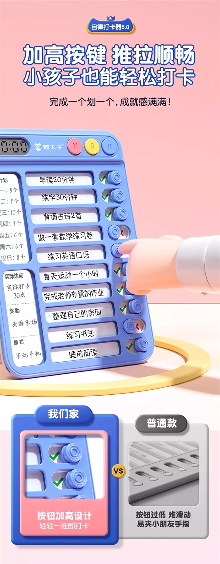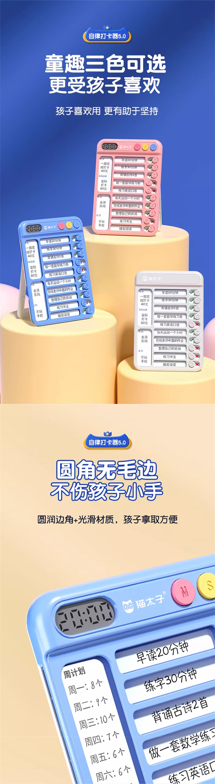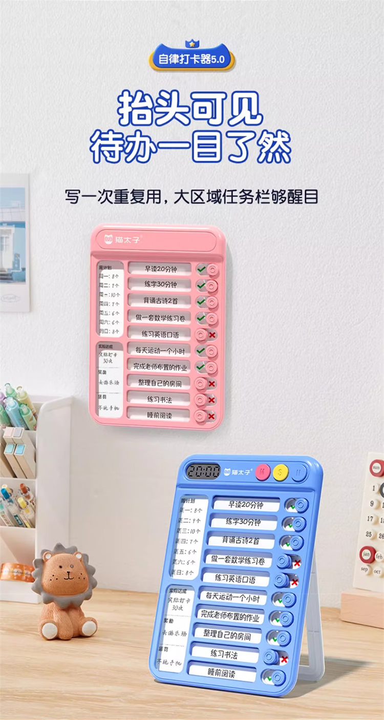 猫太子暑假自律学习计划表打卡器小学生作业课程表儿童自律打卡神器时间管理器每日任务计划本假期记录表 趣计划自律打卡器 蓝